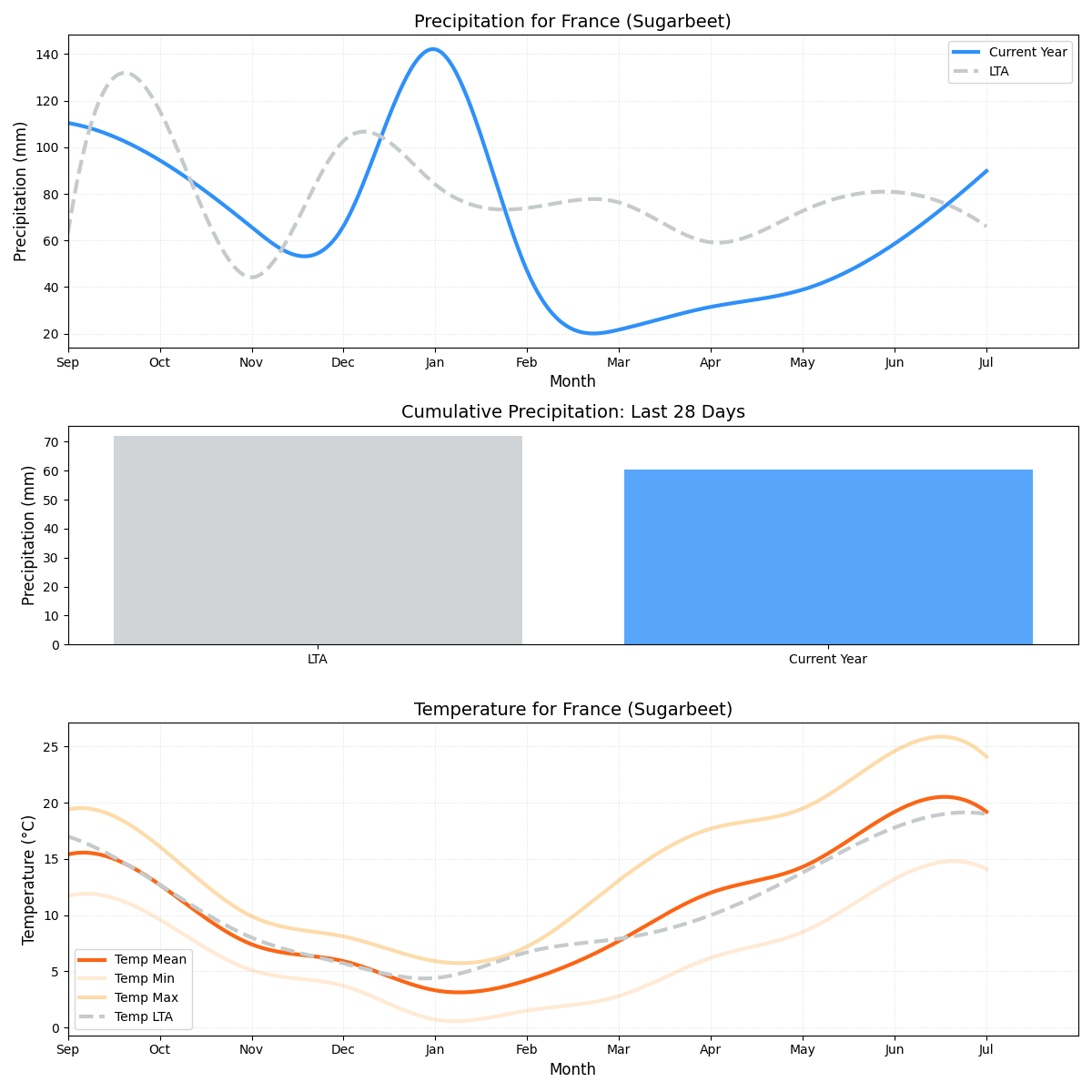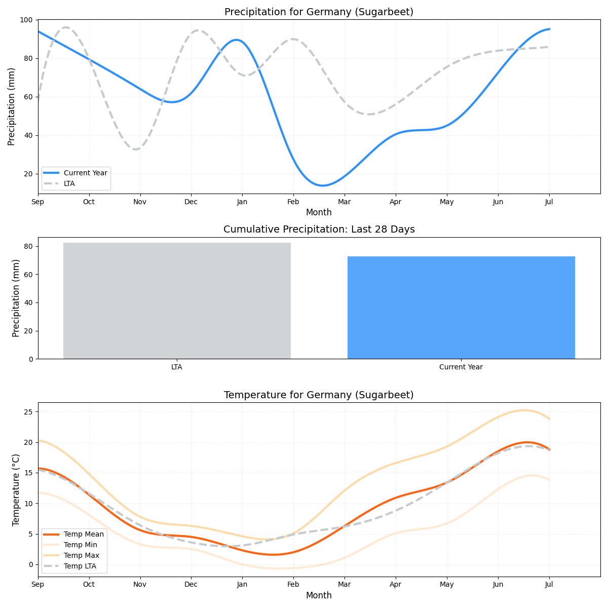 - هطول الأمطار: أقل بشكل ملحوظ من المعتاد مع هطول 24.3 ملم فقط من الأمطار مقارنة بـ 69.41 ملم المعتادة. قد يهدد انخفاض هطول الأمطار صحة بنجر السكر والعائد الإجمالي.