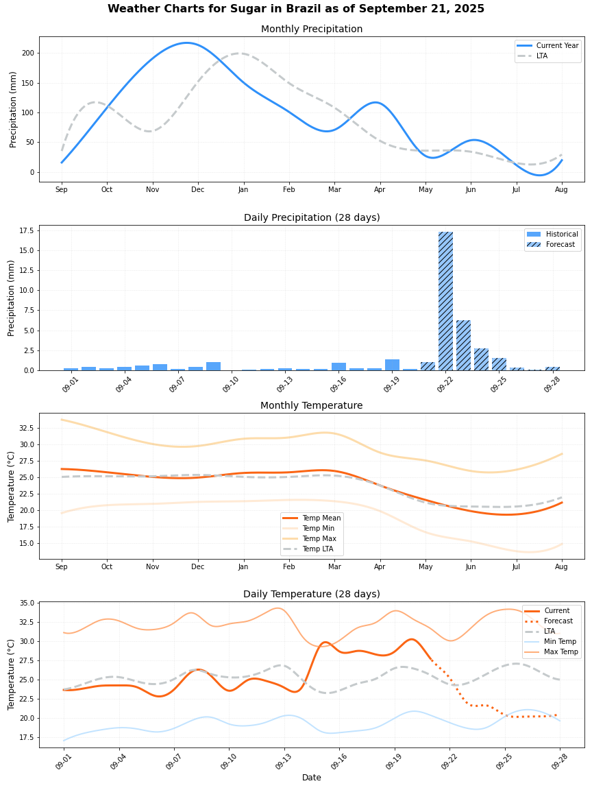 - هطول الأمطار: قريبة جدًا من المتوسط، أقل بنحو 3٪ فقط من المتوسط (178.3 ملم مقابل 184.7 ملم). قد لا يؤثر هطول الأمطار النموذجية هذا بشكل كبير على إنتاج قصب السكر.