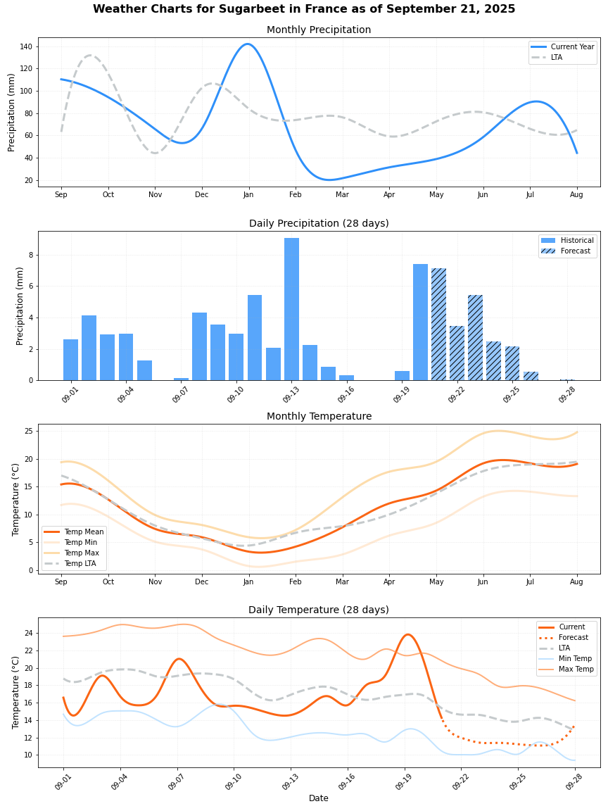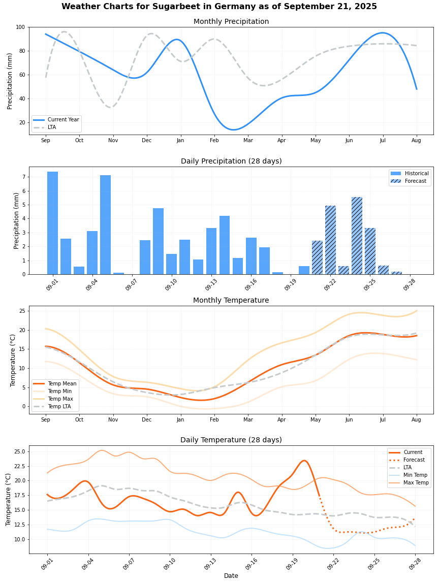 - هطول الأمطار: أعلى بنسبة 122٪ من المتوسط (72.75 ملم مقابل 32.82 ملم). هذه الزيادة الكبيرة في هطول الأمطار تثير القلق لأنها قد تؤثر سلبًا على غلات بنجر السكر.