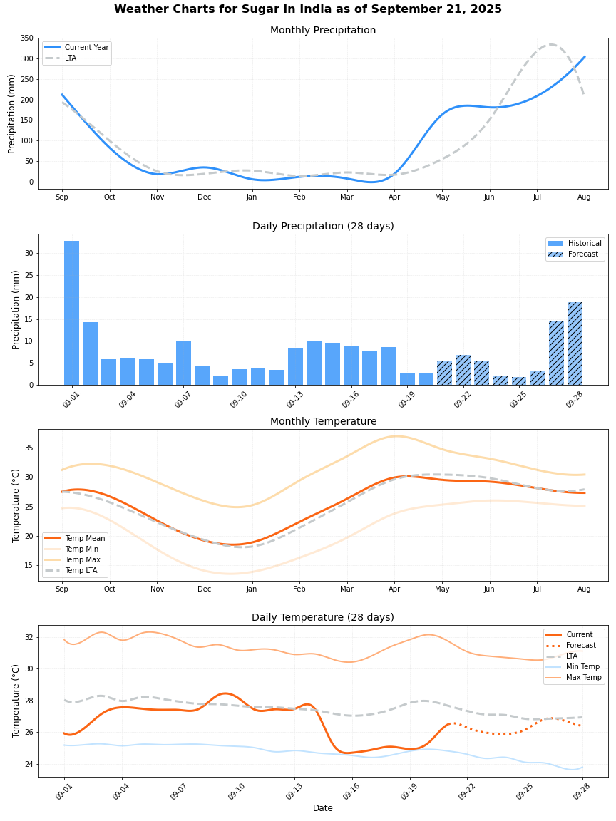 - هطول الأمطار: علاوة على ذلك، فإن هطول الأمطار الملحوظ أعلى بنسبة 34٪ تقريبًا من المتوسط (42.38 ملم مقابل 31.72 ملم)، مما قد يكون ضارًا بغلة قصب السكر إذا استمر.