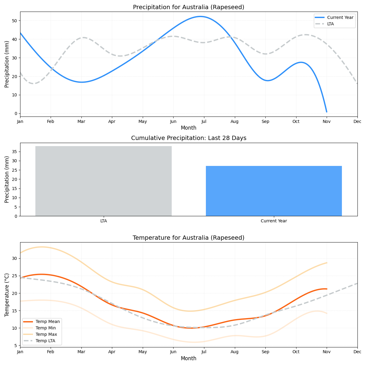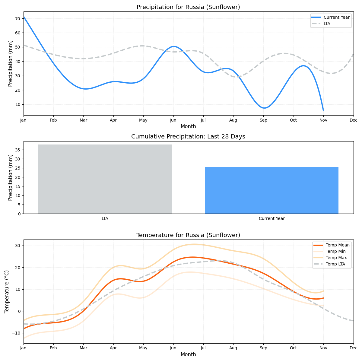 - هطول الأمطار: 47% أقل من المتوسط (0.56 ملم مقابل 1.05 ملم). يؤدي انخفاض هطول الأمطار إلى تفاقم المخاطر التي تواجهها هذه المنطقة الرئيسية المنتجة لبذور اللفت.