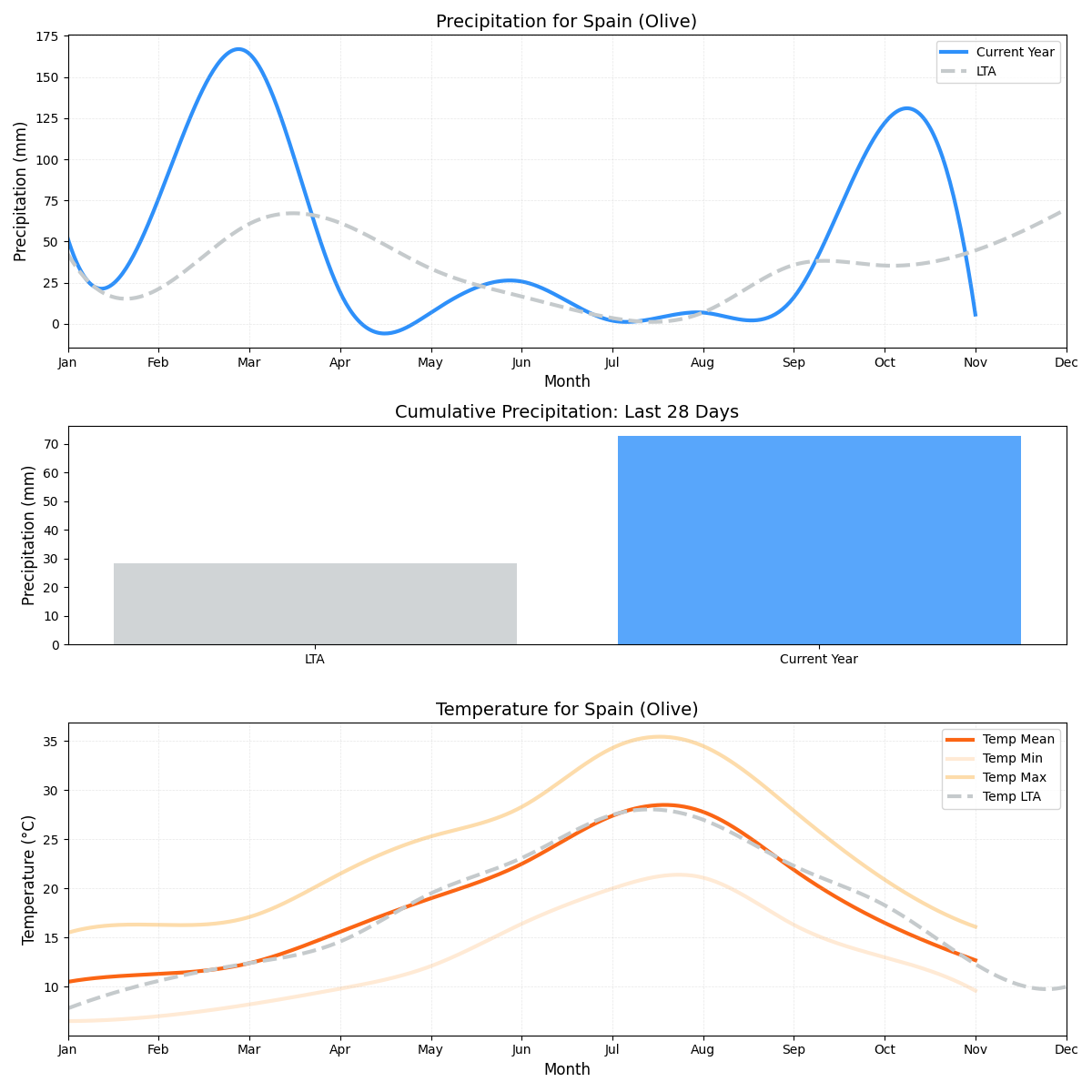 - هطول الأمطار: يتماشى تقريبًا مع المتوسط (3.4 ملم مقابل 3.49 ملم)، مما يشير إلى محصول متوسط مرطب.