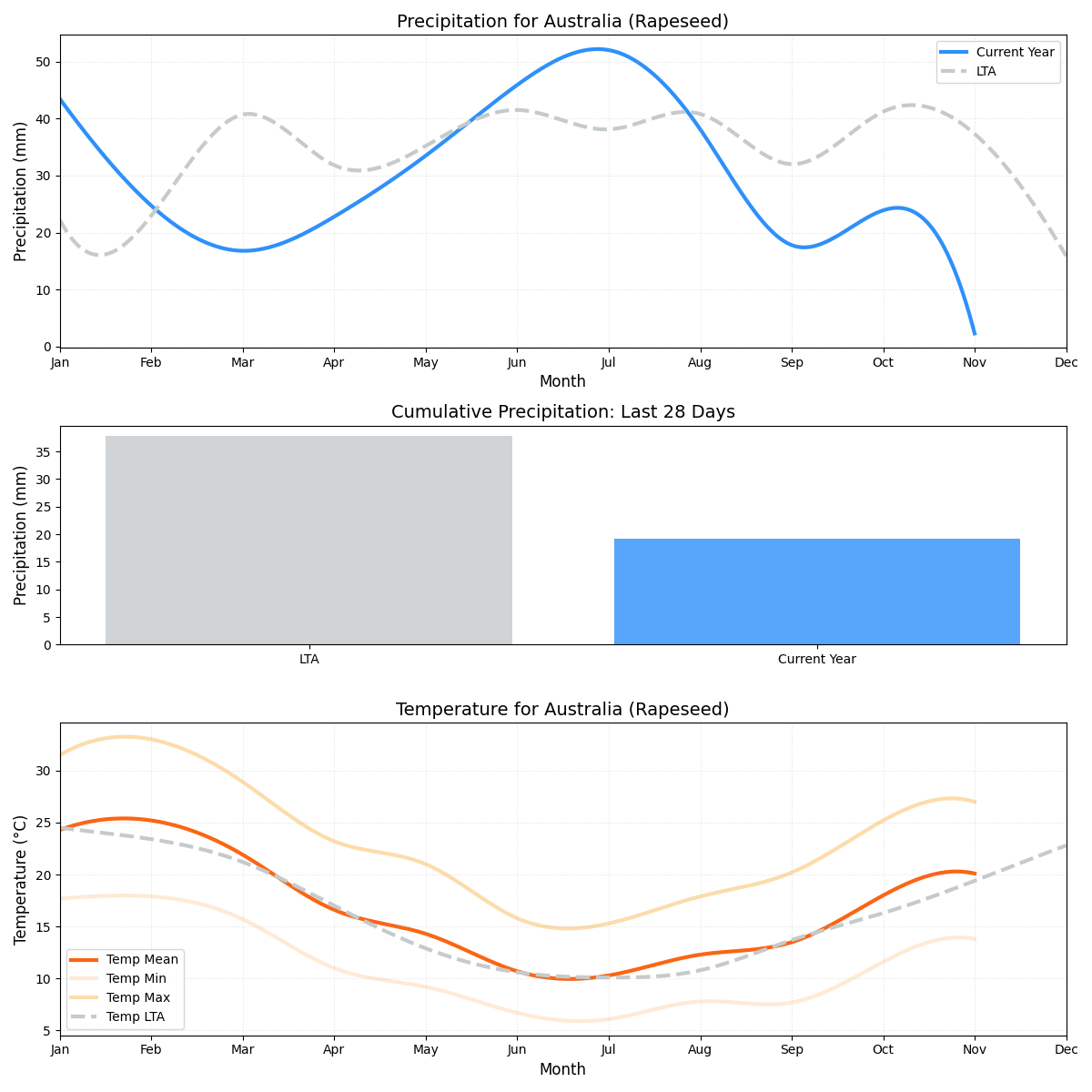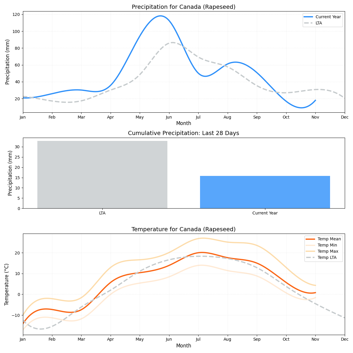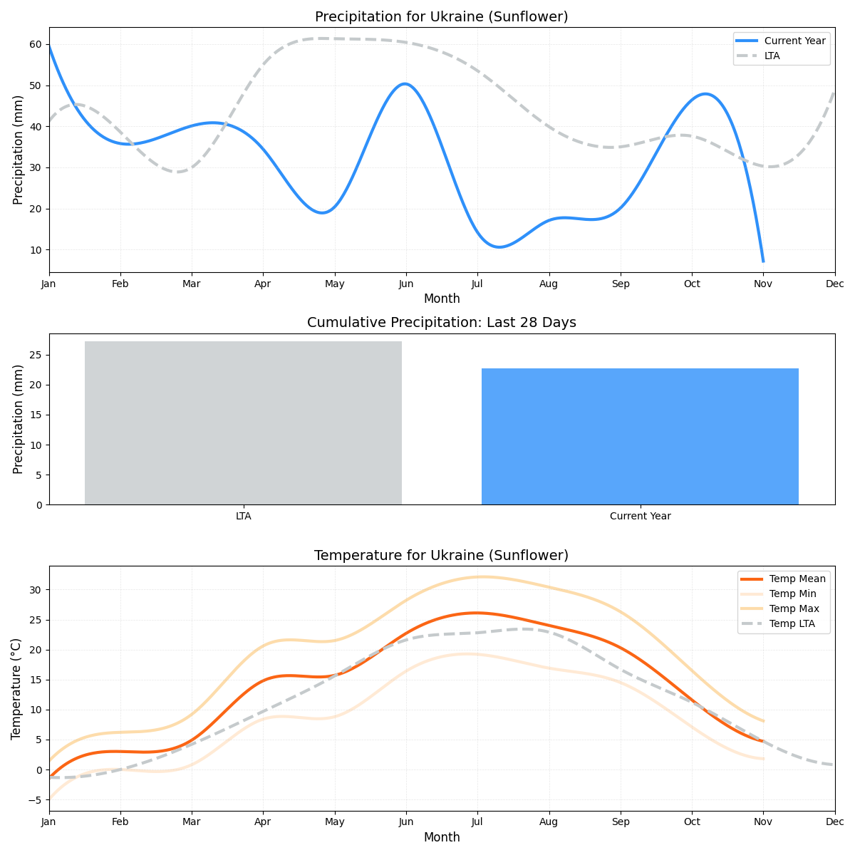 • هطول الأمطار: بشكل ملحوظ 45٪ فوق المتوسط (8.76 ملم مقابل 5.99 ملم)، مما يشير إلى فترة أكثر رطوبة من المعتاد.