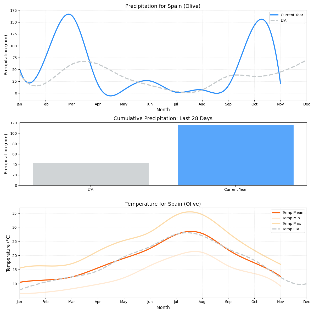 • الخطر الرئيسي: من المتوقع انخفاض إنتاج الزيتون بسبب الأمطار الأقل بشكل كبير وظروف درجة الحرارة الأعلى قليلاً.