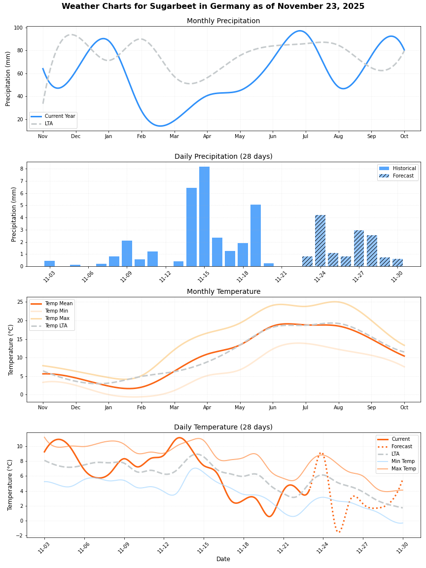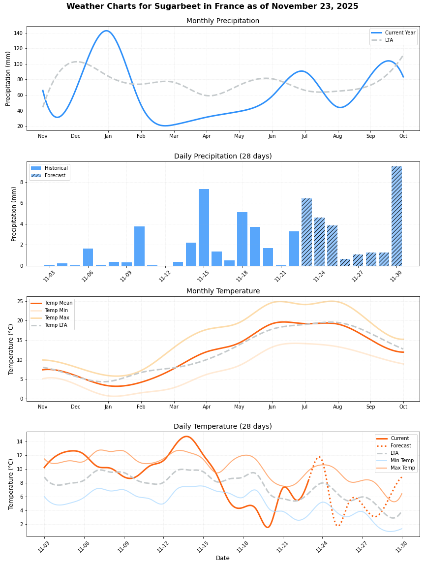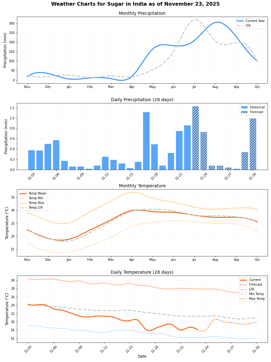 • هطول الأمطار: أقل بحوالي 22% من المتوسط (87.08 ملم مقابل 111.07 ملم). يمكن أن يؤثر هذا الانخفاض في هطول الأمطار على إنتاج المحاصيل.