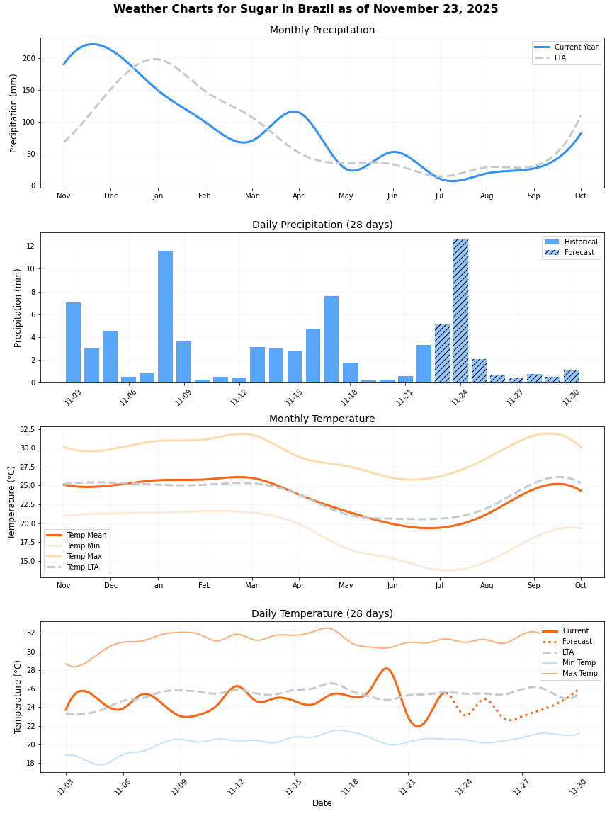 • المخاطر الرئيسية: تمثل كوينزلاند خطرًا كبيرًا بسبب منطقة زراعة قصب السكر الشاسعة بها. تثير الظروف الجوية السيئة الأخيرة مخاوف بشأن التأثير المحتمل على الإنتاج.