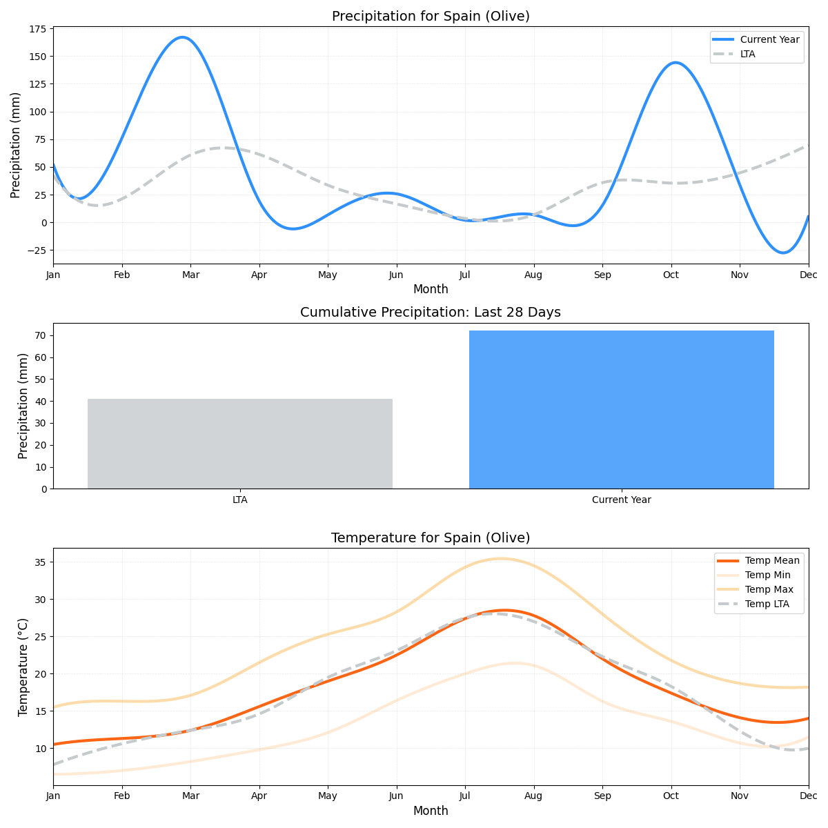 • الخطر الرئيسي: قد تشهد إنتاجية الزيتون في صقلية ضغوطًا طفيفة بسبب زيادة طفيفة في هطول الأمطار وارتفاع درجات الحرارة مما قد يؤثر على جودة المحاصيل.