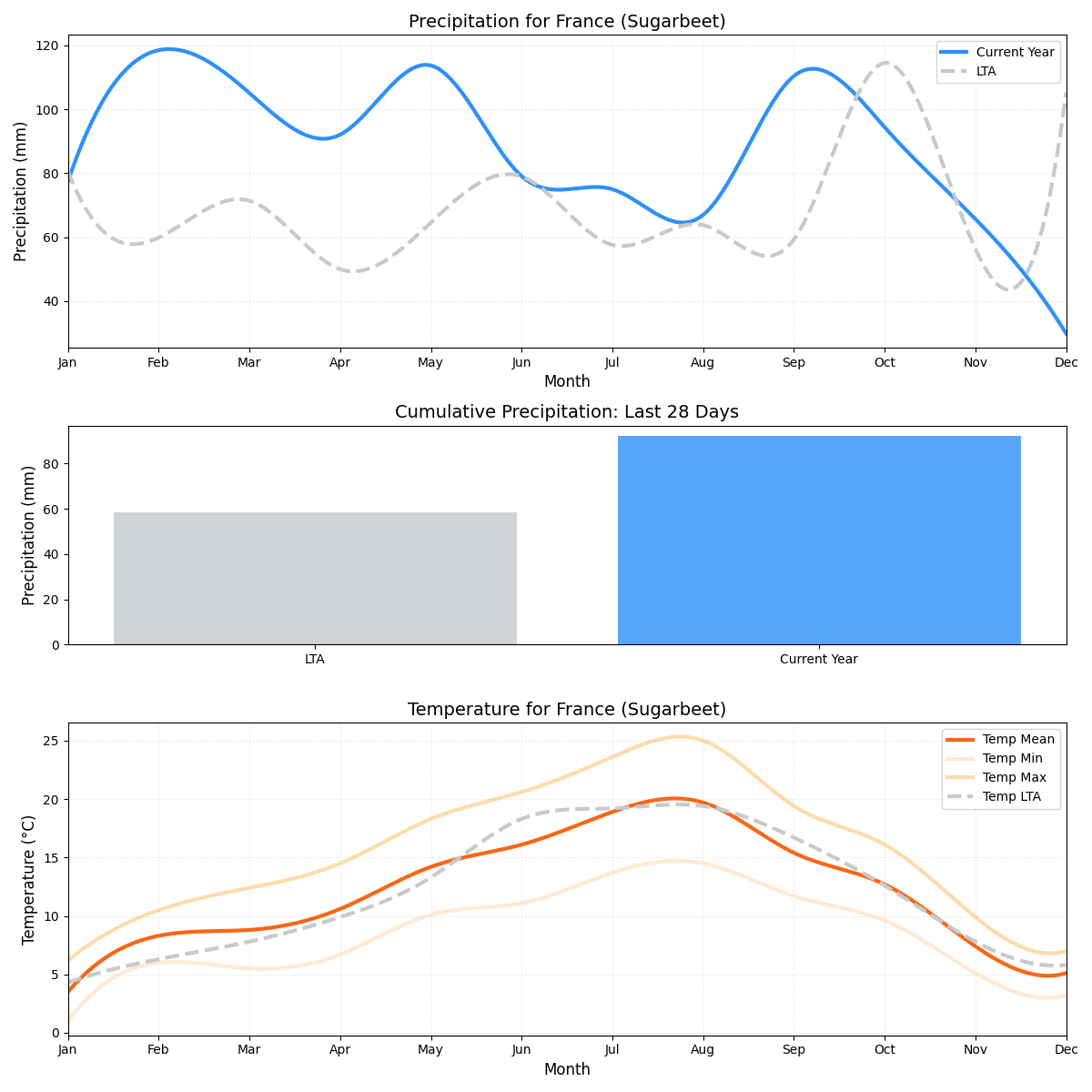 - هطول الأمطار: 93٪ فوق المتوسط (5.78 ملم مقابل 3 ملم). هطول الأمطار المتزايد هو عامل مقلق لأنه أعلى بكثير من المتوسط طويل الأجل، مما قد يؤدي إلى تشبع التربة بالمياه وتلف المحاصيل.
