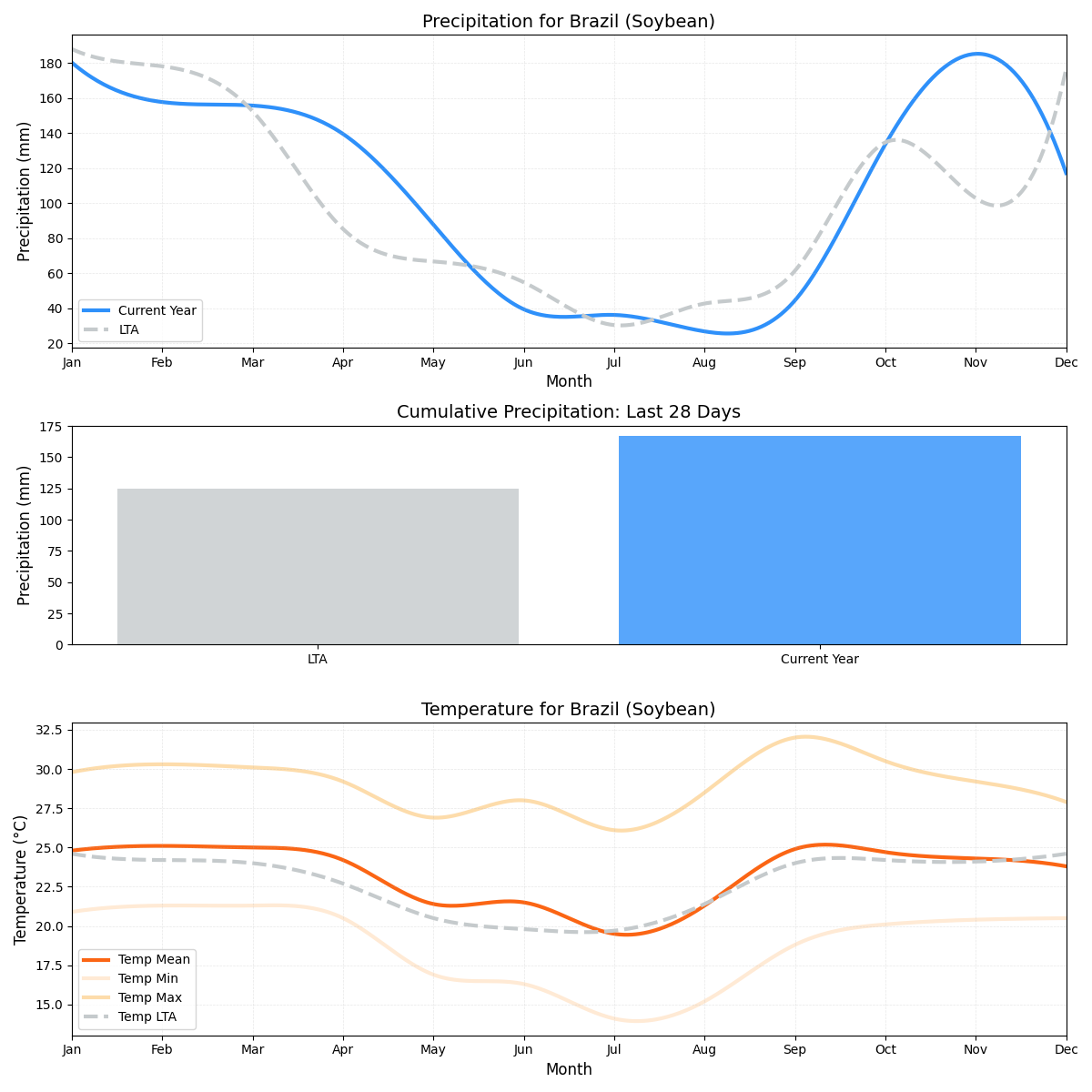 - هطول الأمطار: أقل بكثير من المتوسط بحوالي 61٪ من المتوسط طويل الأجل (6.25 ملم مقابل 10.28 ملم)، مما قد يؤثر على مستويات رطوبة التربة مما يؤثر على الغلات الإجمالية.