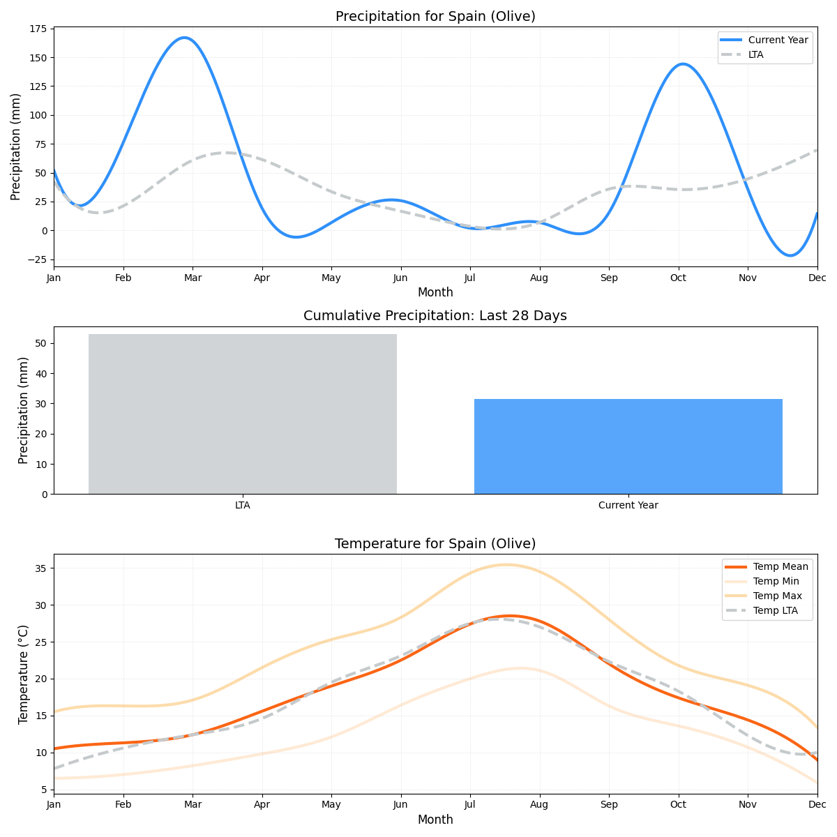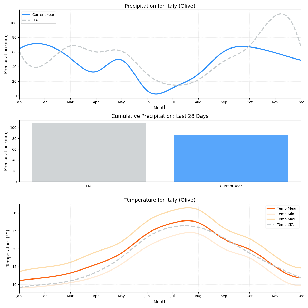- درجة الحرارة: أعلى بحوالي 3٪ من المتوسط (12.95 درجة مئوية مقابل 12.58 درجة مئوية). قد تؤثر درجات الحرارة المرتفعة على نضج الزيتون وصحة المحاصيل.