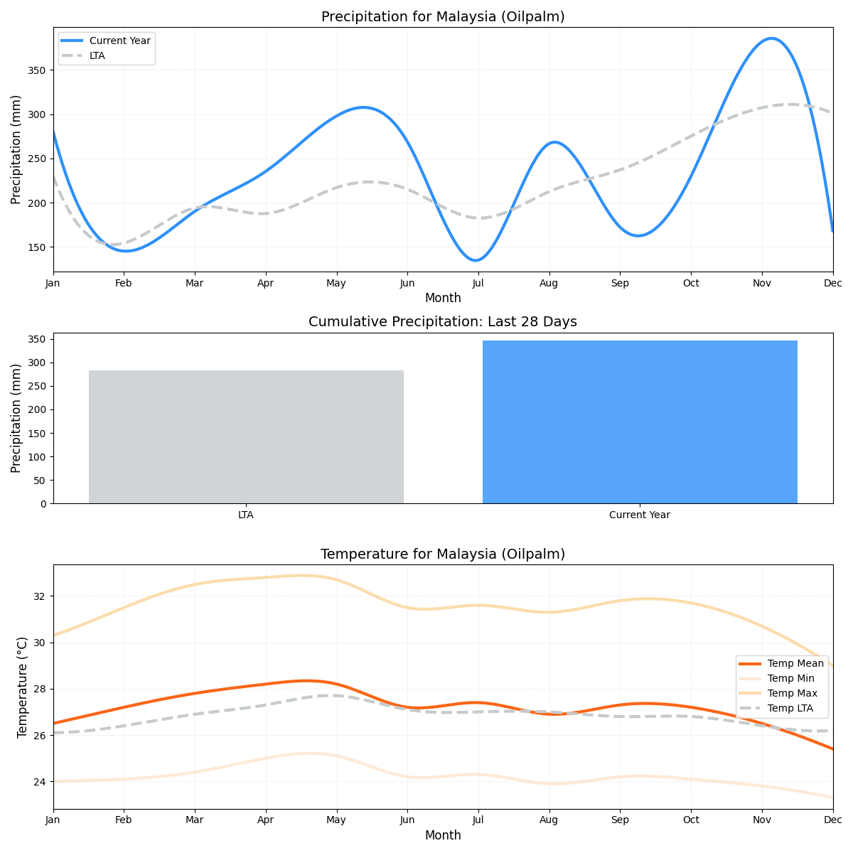 - هطول الأمطار: أعلى قليلاً من المتوسط (10.99 ملم مقابل 10.64 ملم)، مما يوفر سياق رطوبة أفضل قليلاً لزراعة زيت النخيل.