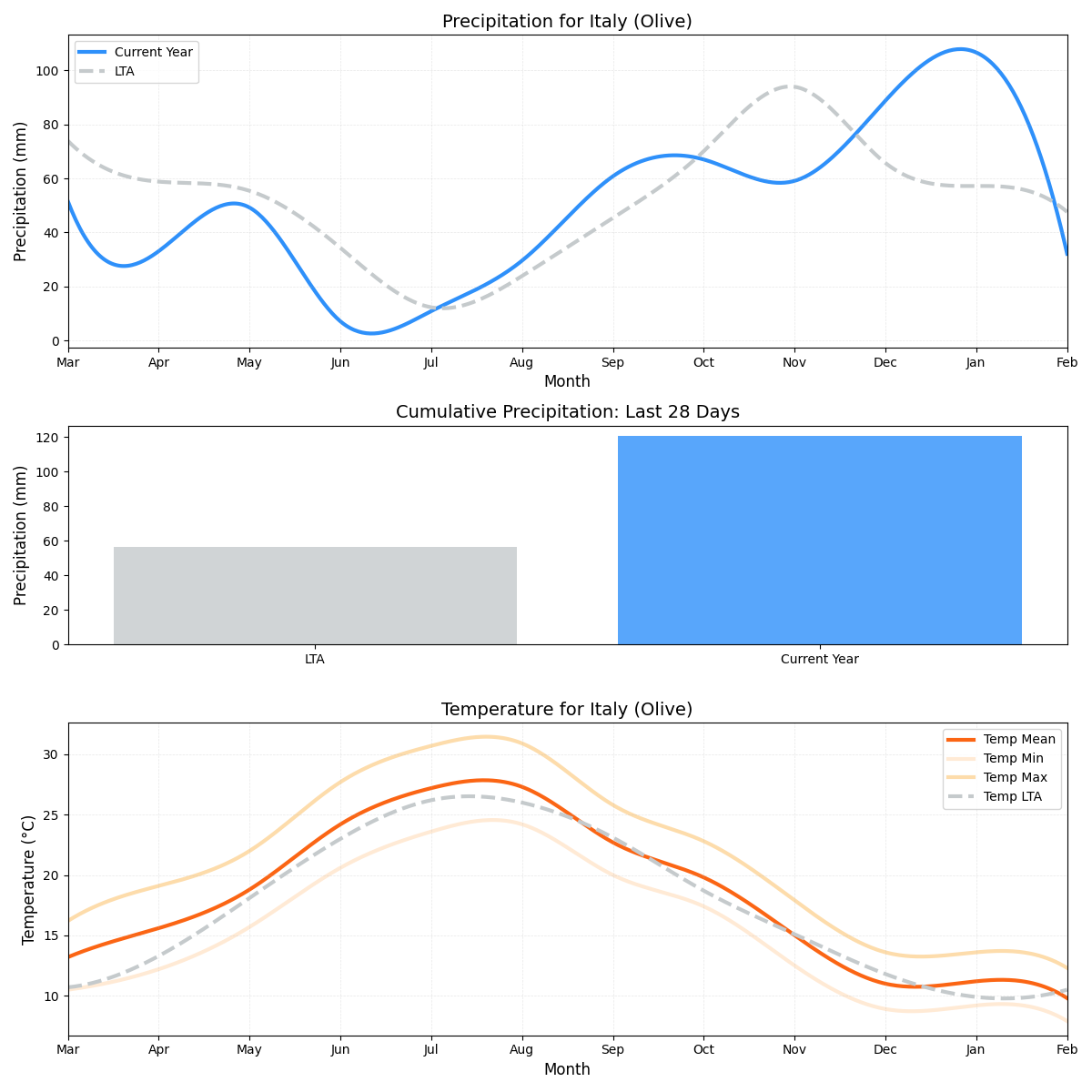 - هطول الأمطار: أعلى بنسبة 112٪ من متوسط قيم هطول الأمطار، مما يثير مخاوف بشأن المحاصيل (4.96 ملم مقابل 2.34 ملم).