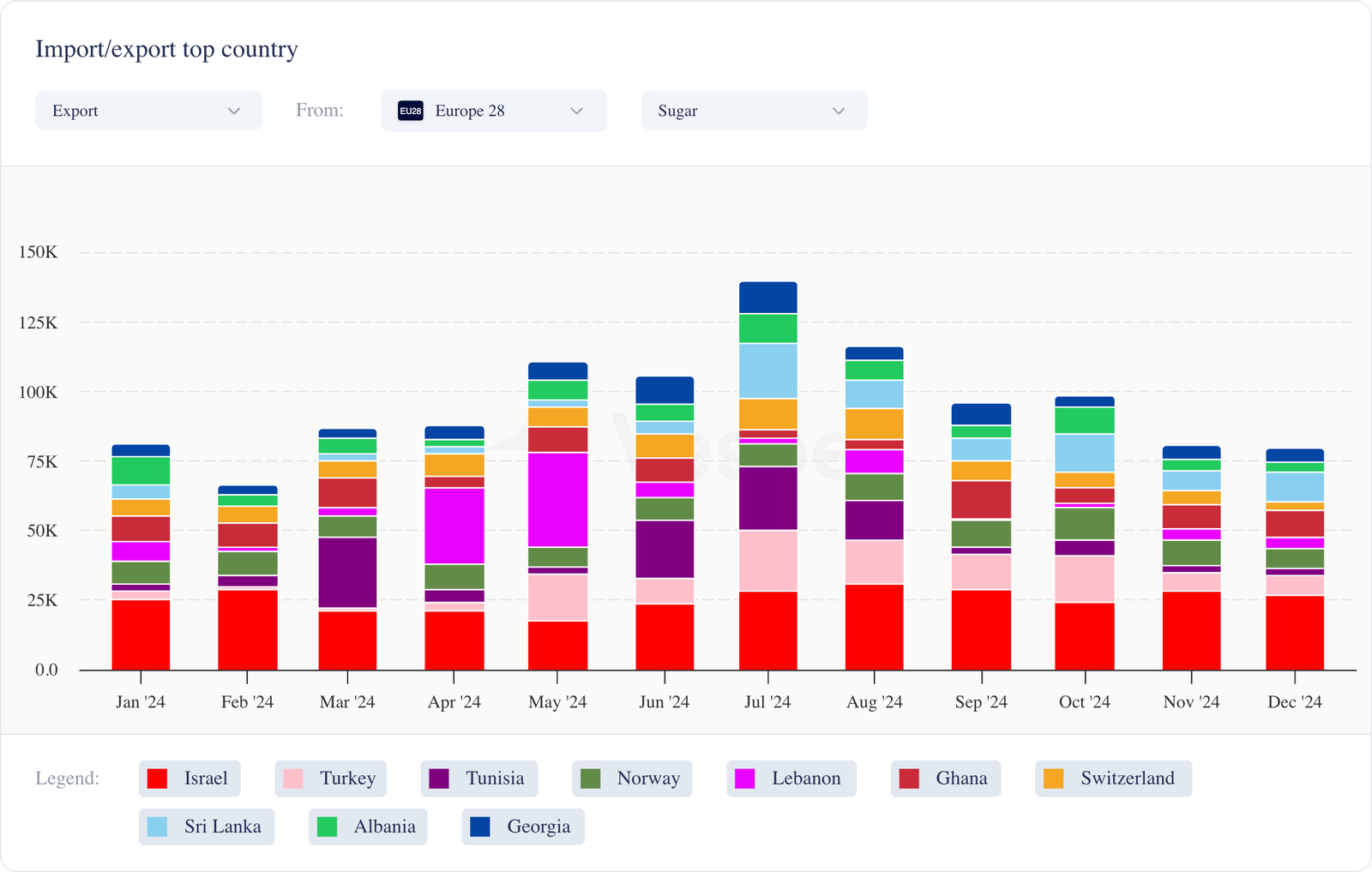 - بلغت صادرات السكر من الاتحاد الأوروبي 28 لشهر أكتوبر إلى ديسمبر 2024 ما يقرب من 485000 طن، بزيادة قدرها 58٪ عن نفس الفترة في 23/24. بلغت الواردات 411000 طن، بانخفاض 51٪؛