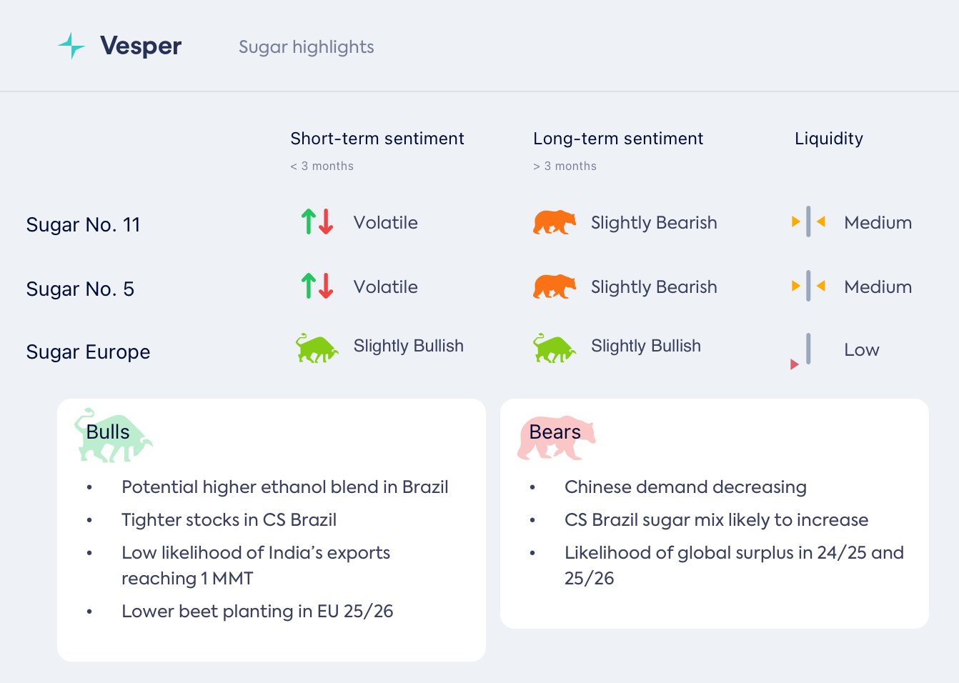 في أوروبا، من المتوقع أن ترتفع الأسعار وسط تخفيضات الإنتاج، ولكن على مستوى العالم، قد تنخفض الأسعار مع بدء موسم الإنتاج في البرازيل 2025/26. تضيف جهود أوكرانيا لاستعادة حصص التصدير من الاتحاد الأوروبي حالة من عدم اليقين. في حين أنه من المتوقع وجود فائض عالمي على المدى المتوسط إلى الطويل، ستظل الظروف الجوية والطلب الصيني المتقلب محركات حاسمة.