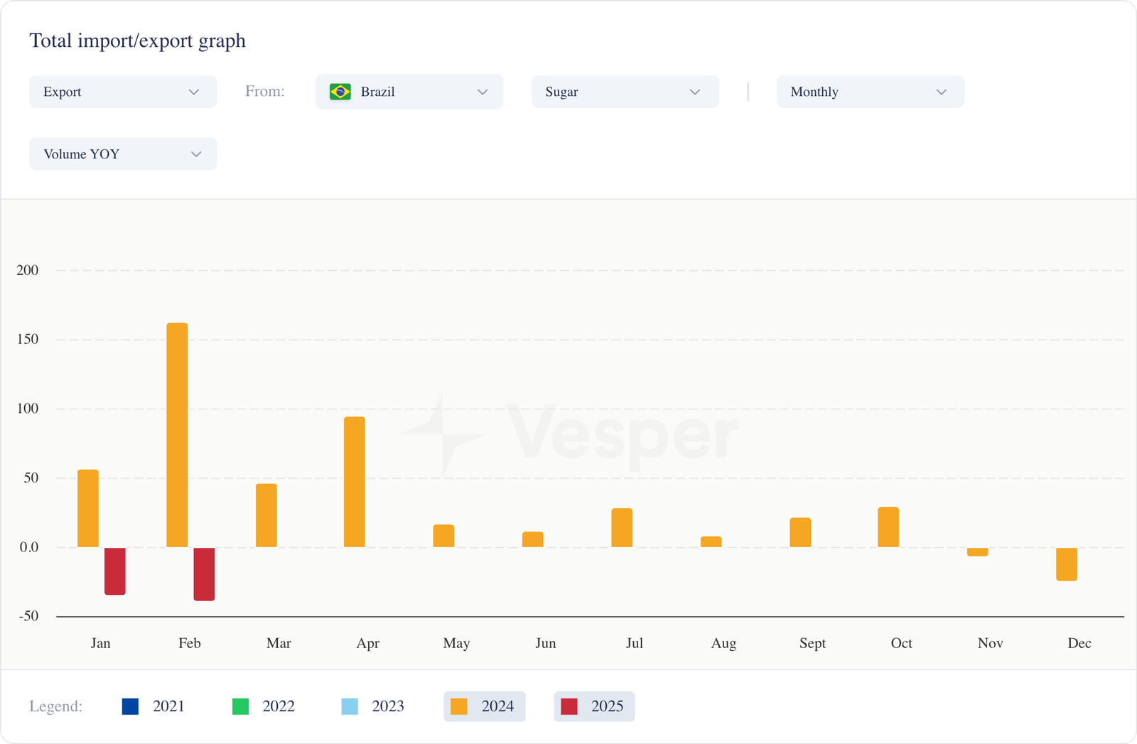 - في فبراير، صدرت البرازيل 1.8 مليون طن متري من السكر، بانخفاض 39٪ مقارنة بشهر فبراير/24؛