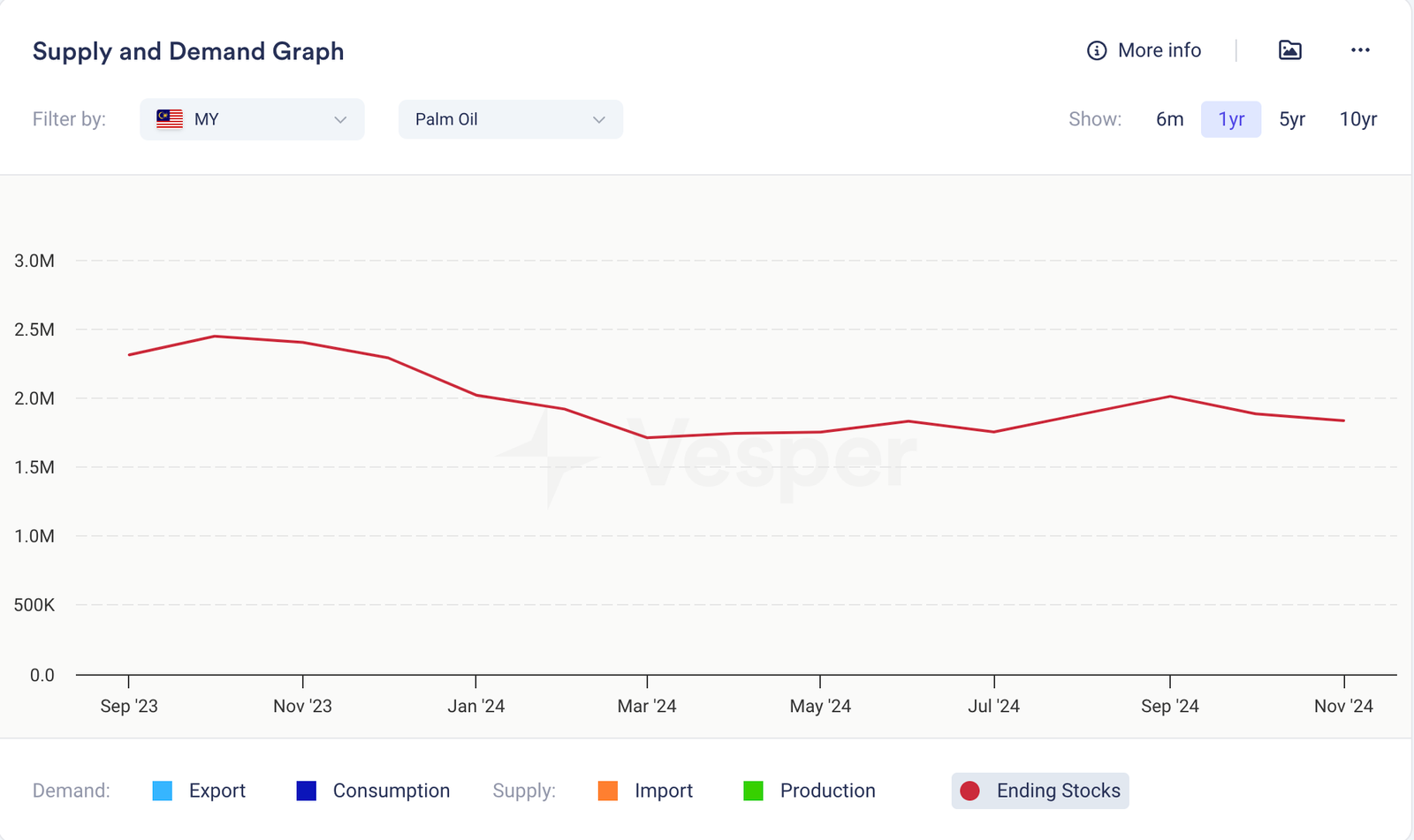 - ومع ذلك، أفاد مجلس زيت النخيل الماليزي (MPOB) أن المخزونات انخفضت بنسبة 2.6٪ فقط إلى 1.836 مليون طن متري، في حين أظهرت الصادرات انخفاضًا حادًا بنسبة 15٪ تقريبًا، لتصل إلى 1.487 مليون طن متري