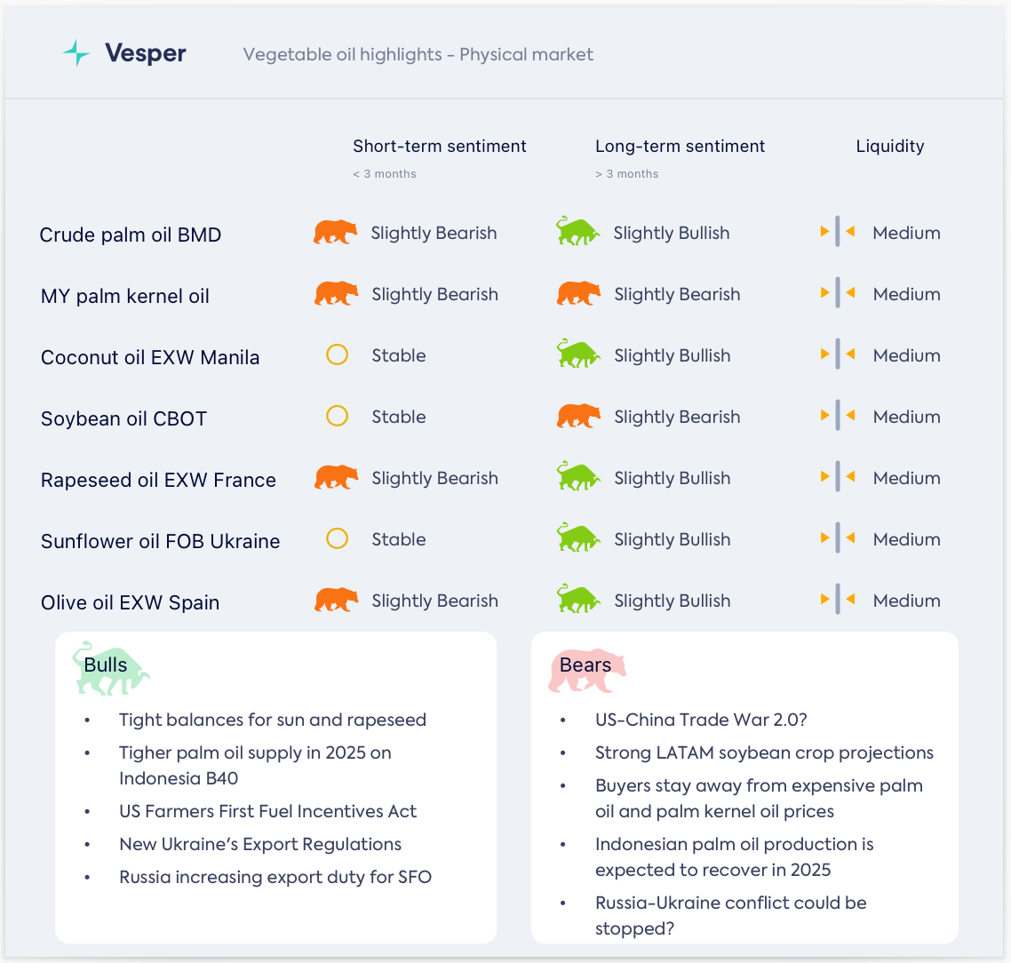 على المدى القصير: يبدو أن التوقعات الصعودية للتوازن الكندي قد تم تسعيرها. سيركز اهتمام السوق على أي تطورات دبلوماسية بين الولايات المتحدة وكندا، خاصة وأن ترامب وعد بفرض تعريفات جمركية بنسبة 25٪ على السلع الكندية. من المحتمل أن تتبع بذور اللفت، التي حققت مكاسب كبيرة في الأشهر الأخيرة بالنسبة لزيت النخيل، تحركات زيت النخيل وتتفاعل مع أي تصحيح محتمل (صغير؟) لأسعار زيت النخيل. بشكل عام، نحافظ على موقف هبوطي قليلاً.