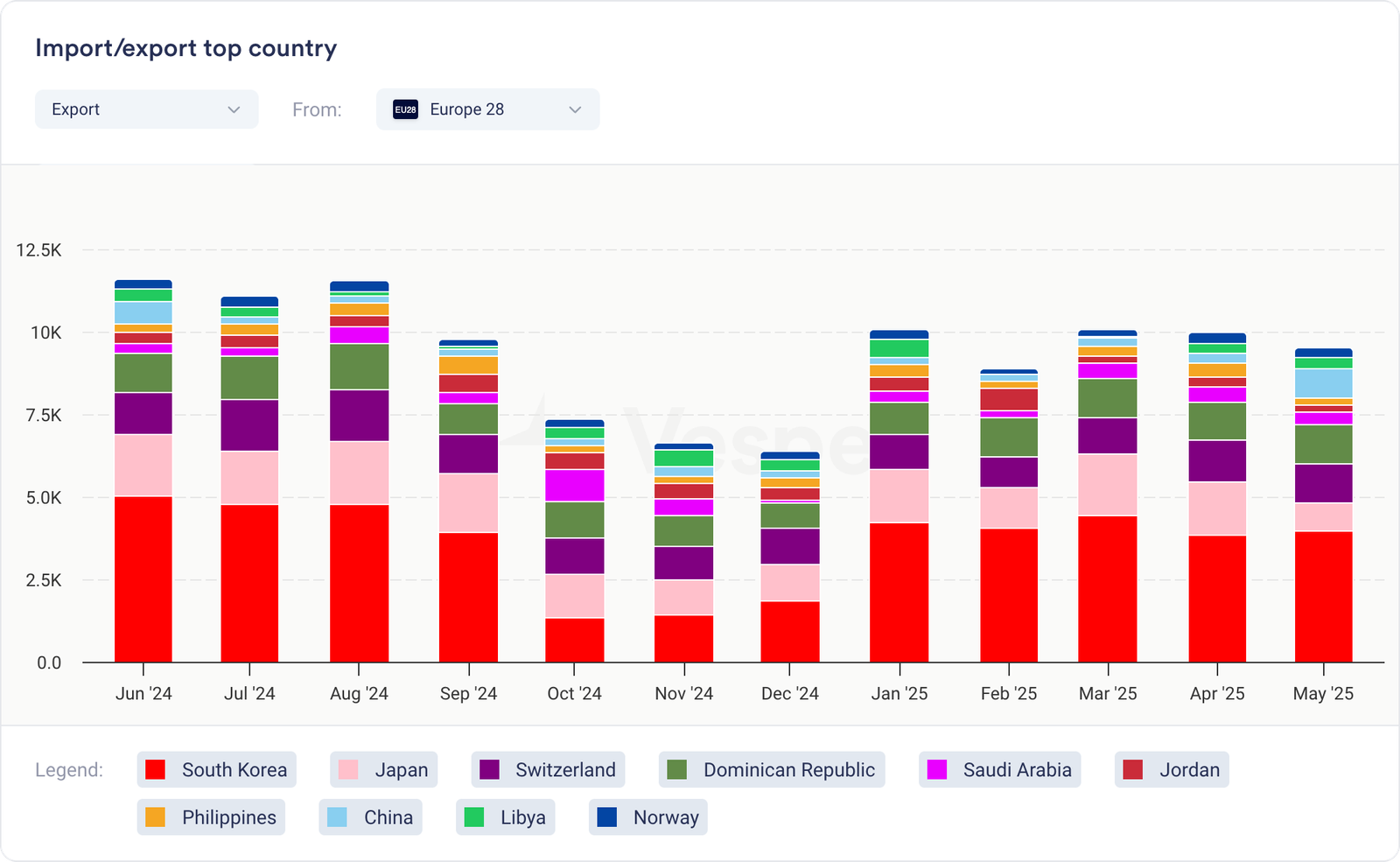 • من الناحية الأساسية، تشعر السوق الأوروبية بثقل طفيف بسبب (من بين أمور أخرى) انخفاض الصادرات في عام 2025 حتى الآن، وخاصة إلى الدول الآسيوية