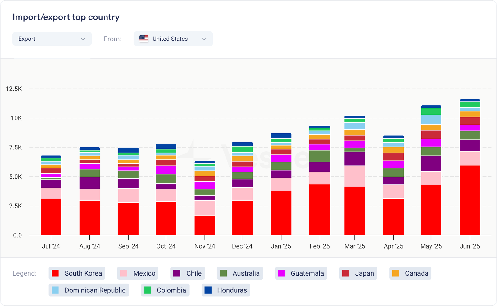 • زادت الصادرات الأمريكية من الجبن الطازج (الذي يشمل الموزاريلا) بشكل كبير نحو جميع الوجهات، ولكن كوريا الجنوبية على وجه الخصوص، لأنها الأكثر حساسية للسعر