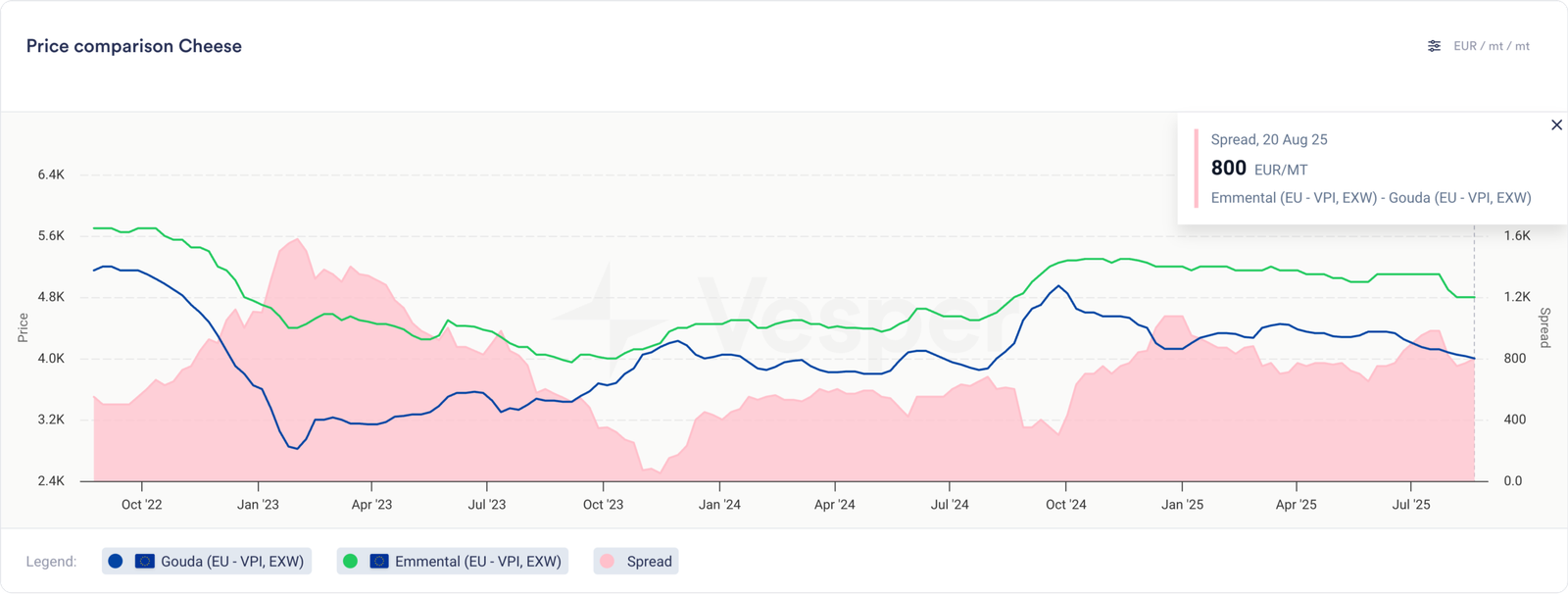 • نظرًا لأن أسعار أنواع الجبن الأخرى تنخفض أكثر قليلاً هذا الأسبوع، فمن المحتمل أن تتبع أسعار إمنتال هذا المسار في الأسابيع المقبلة، حيث لا يزال الطلب منخفضًا