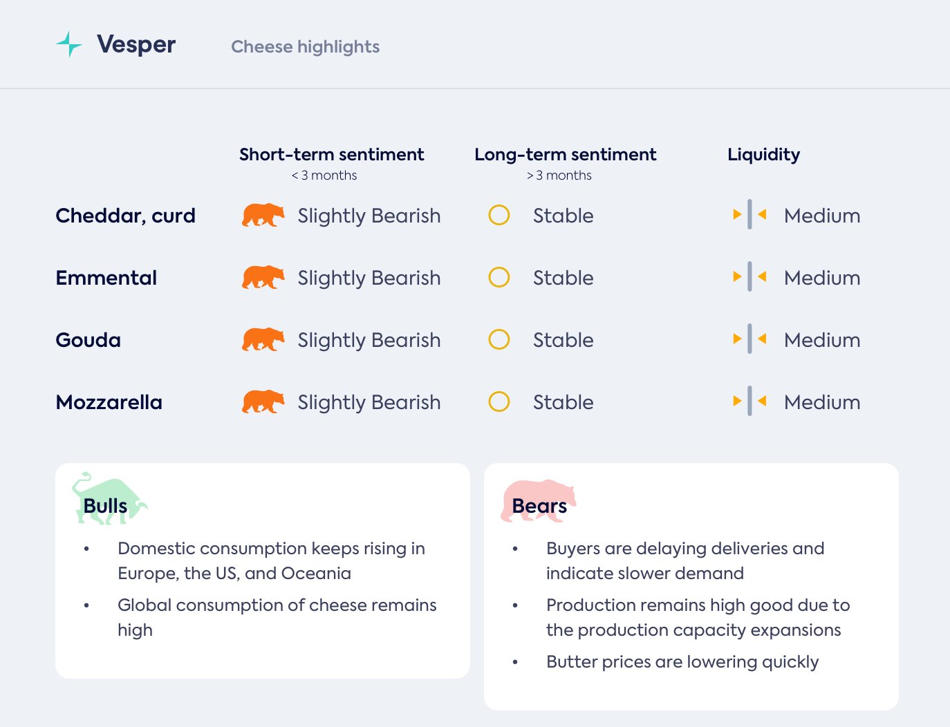 • إمدادات الجبن والشيدر جيدة نسبيًا في السوق الأوروبية، لكن الشركات المصنعة لا تزال تشير إلى أن توفر وأعمار أنواع الجبن الخاصة بها تحت السيطرة