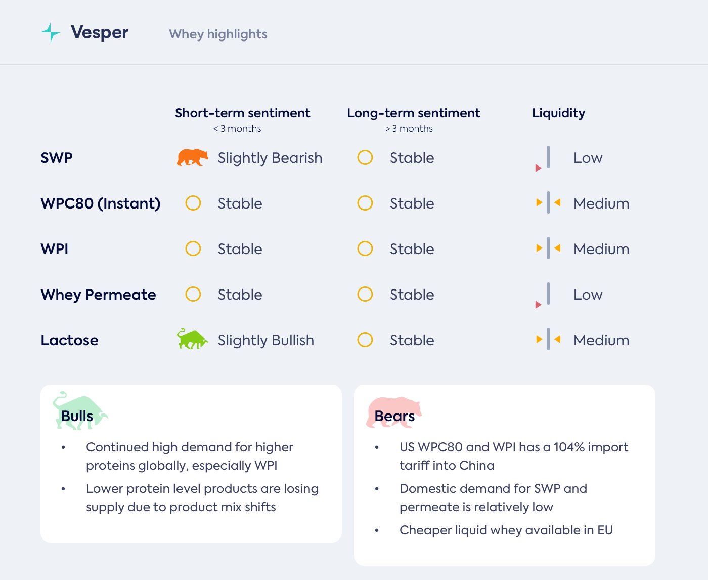 لتكون أكثر تحديدًا: مصل اللبن الأمريكي واللاكتوز و WPC و WPI ليتم شحنها إلى العملاء الصينيين. إن تعريفة الاستيراد البالغة 104٪ تجعل المنتج الأمريكي باهظ الثمن ببساطة. لاستبدال مصل اللبن الأمريكي في الصين، سيأتي المزيد من أوروبا من الآن فصاعدًا، وهو ما يفعله العديد من المشترين بشكل استباقي.
