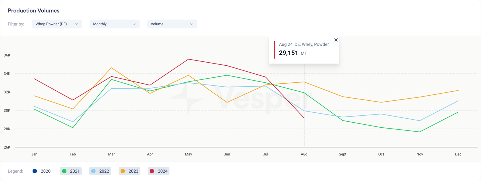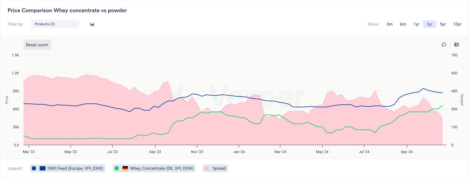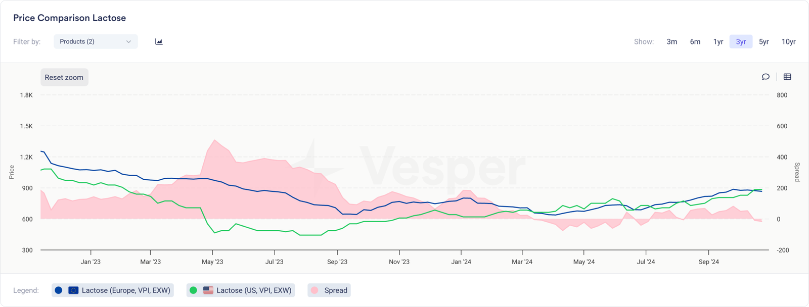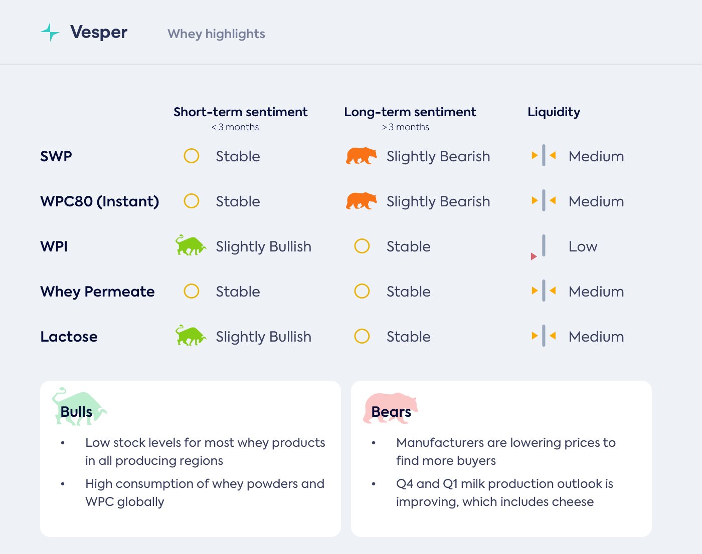 سيؤدي التوافر الجيد جدًا لاختراق مصل اللبن إلى إبقاء الأسعار منخفضة، حول المستويات التي يتم تداولها بها حاليًا. سنحتاج حقًا إلى رؤية ضغط في الإنتاج قبل أن نحصل على أسعار اختراق أعلى بكثير. نظرًا لأن إنتاج WPC سيظل مرتفعًا في كل مكان، يمكن أن يكون اللاكتوز هو المنفذ الذي يساعد في الاختراق. لكن هذا لا يبدو مرجحًا في الوقت الحالي، مما يحافظ على استقرار الأمور.