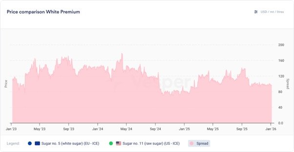 • يبلغ سعر السكر المكرر (BR، سعر الشريك، تسليم ظهر السفينة البرازيل) (06/01/2026) 425 دولارًا أمريكيًا للطن المتري؛