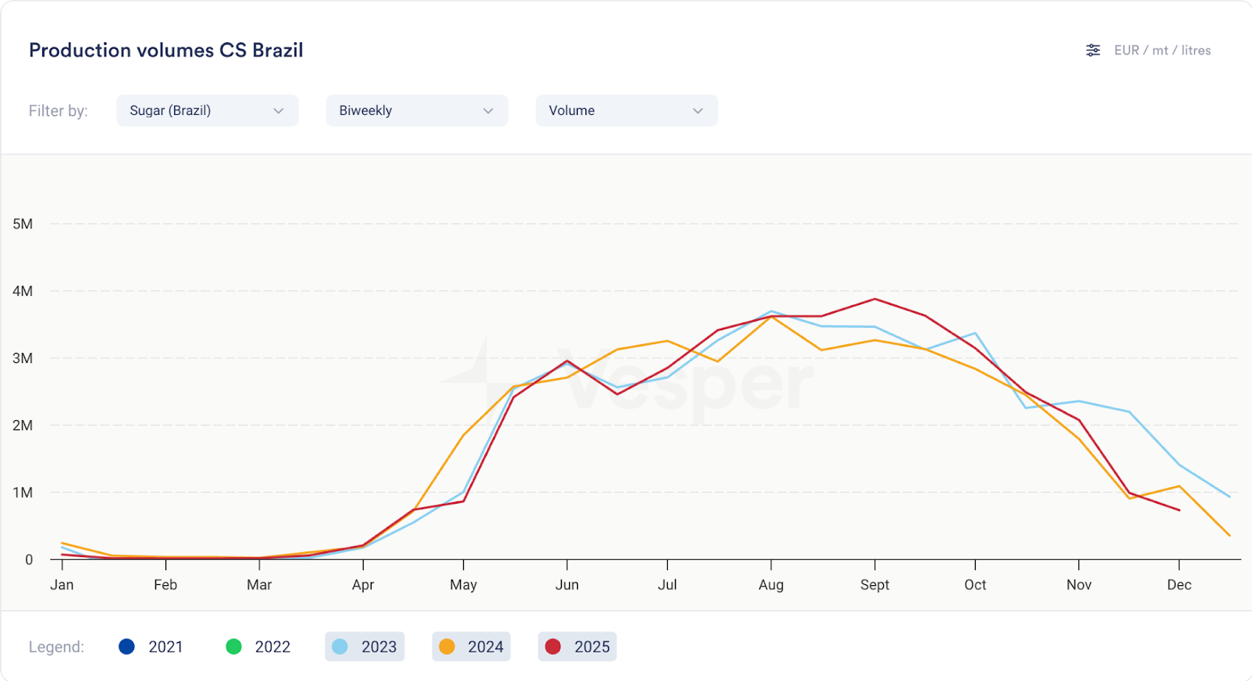 • أظهر النصف الثاني من شهر نوفمبر أداءً متدهورًا حيث تم سحق 16.0 مليون طن متري من القصب (بانخفاض 21.1٪ على أساس سنوي)، مما أدى إلى إنتاج 724 ألف طن من السكر (بانخفاض 32.9٪) و 1.2 مليار لتر من إجمالي الإيثانول (بانخفاض 1.3٪)، حيث انخفض مزيج السكر بشكل حاد إلى 35.5٪ مقابل 44.6٪ في نفس الفترة من العام الماضي مما يعكس التحول المتسارع نحو الإيثانول بينما تحسن ATR بنسبة 6.8٪ إلى 133.8 كجم / طن؛
