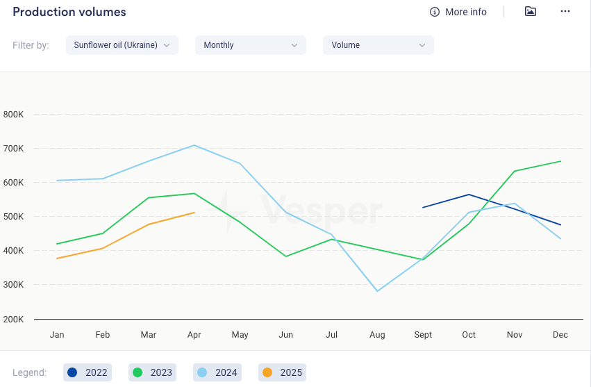 - في الربع الأول، سحقت الأرجنتين 858000 طن متري من بذور عباد الشمس (–2.5٪ مقارنة بالربع الأول من العام الماضي)، مما يشير إلى أن السحق الأكثر نشاطًا قد يحدث في النصف الثاني. وفقًا لـ Agroexport، يمكن أن يدعم هذا أسعار زيت عباد الشمس في البحر الأسود