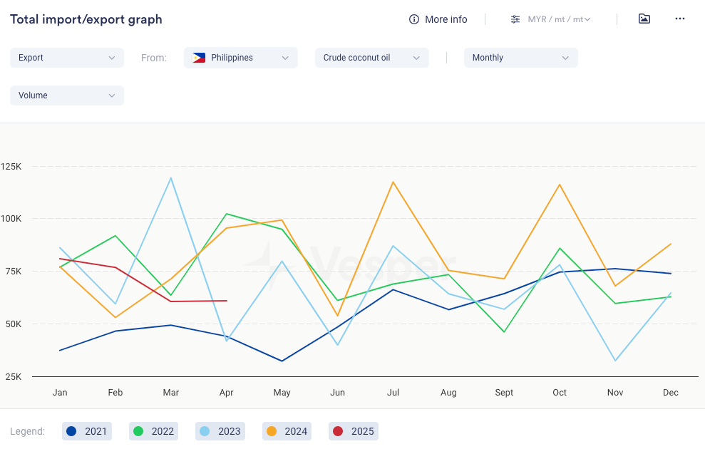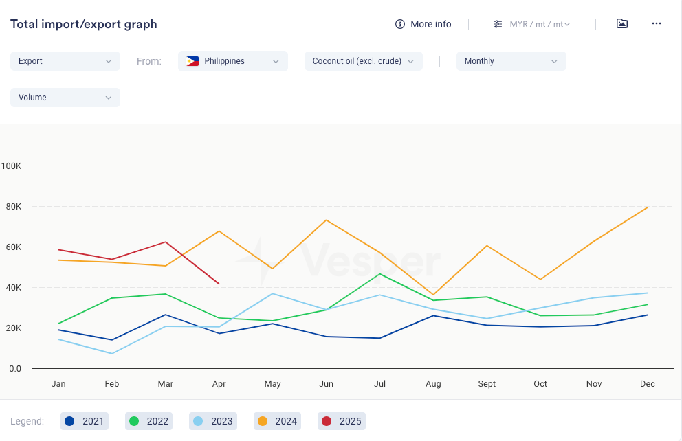 - كانت صادرات زيت جوز الهند من الفلبين أقل في أبريل مقارنة بالشهر نفسه من العام الماضي، مما أدى إلى انخفاض إجمالي يناير-أبريل مقارنة بالعام السابق