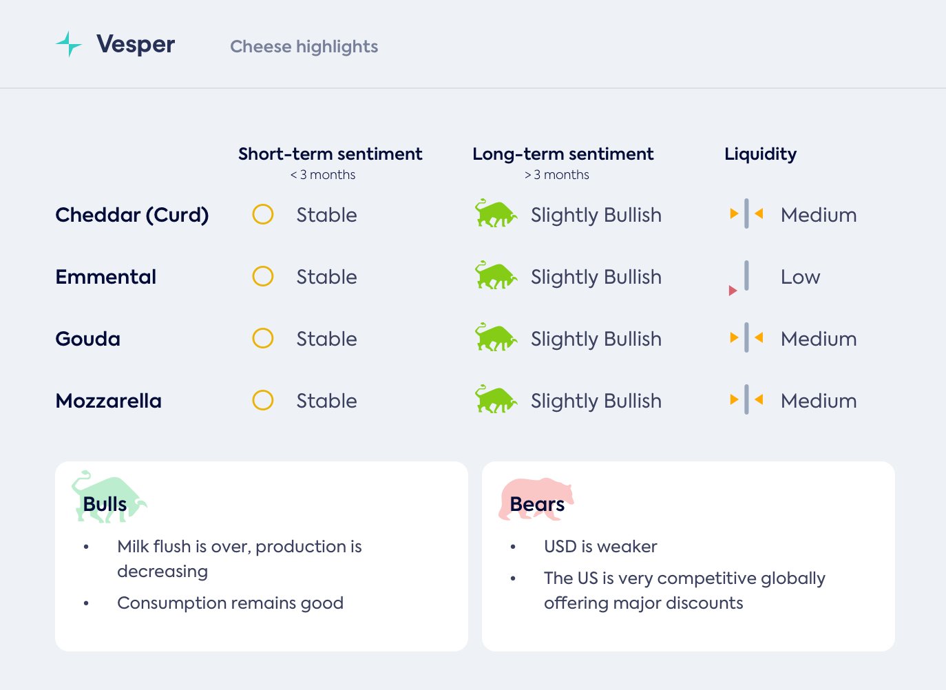 توقعات إيمنتال مستقرة حاليًا للأسابيع القليلة المقبلة، حيث من المحتمل أن يظل كل من الإنتاج والطلب عند مستويات عالية. بعد ذلك، من المثير للاهتمام أن نرى ما إذا كان إنتاج إيمنتال سيفضل على السلع الأخرى عندما لا تكون إمدادات الحليب في كامل طاقتها. لكن هذا لا يزال بعيدًا.
