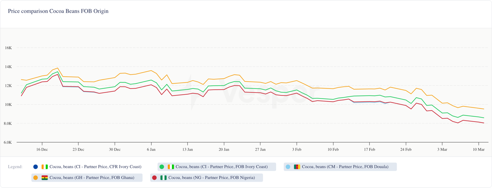 شهدت أسعار حبوب تسليم ظهر السفينة (FOB) من كوت ديفوار ونيجيريا وغانا انخفاضات طفيفة في جميع المجالات. شهدت زبدة الكاكاو الفورية الأوروبية أكبر انخفاض، حيث انخفضت بنسبة 9٪ تقريبًا على أساس أسبوعي، مما يعكس المخاوف المستمرة بشأن ضعف الطلب. ومع ذلك، فإن هذا الانخفاض أقل حدة من الانخفاض بنسبة 20٪ الذي شوهد قبل أسبوعين. وفي الوقت نفسه، تستمر أسعار مسحوق الكاكاو في الارتفاع بثبات، متجاوزة علامة 9,300 يورو اعتبارًا من يوم أمس.