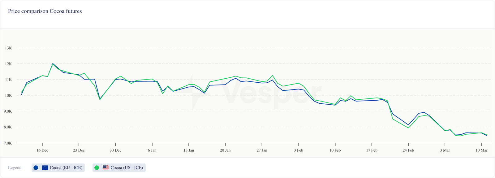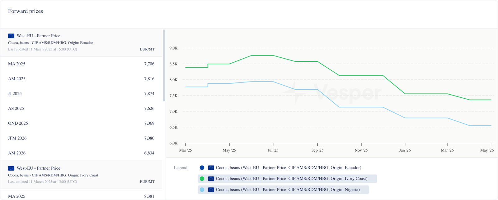 ارتفعت الأسعار الآجلة لحبوب الكاكاو من كوت ديفوار ونيجيريا بشكل طفيف لعقود شهري مايو ويونيو. ومع ذلك، اعتبارًا من سبتمبر 2025 فصاعدًا، تراجعت الأسعار إلى ما دون المستويات الفورية الحالية. يتم تسعير عقود مايو 2026 حاليًا بسعر 7,357 يورو لكوت ديفوار و 6,544 يورو لغانا.
