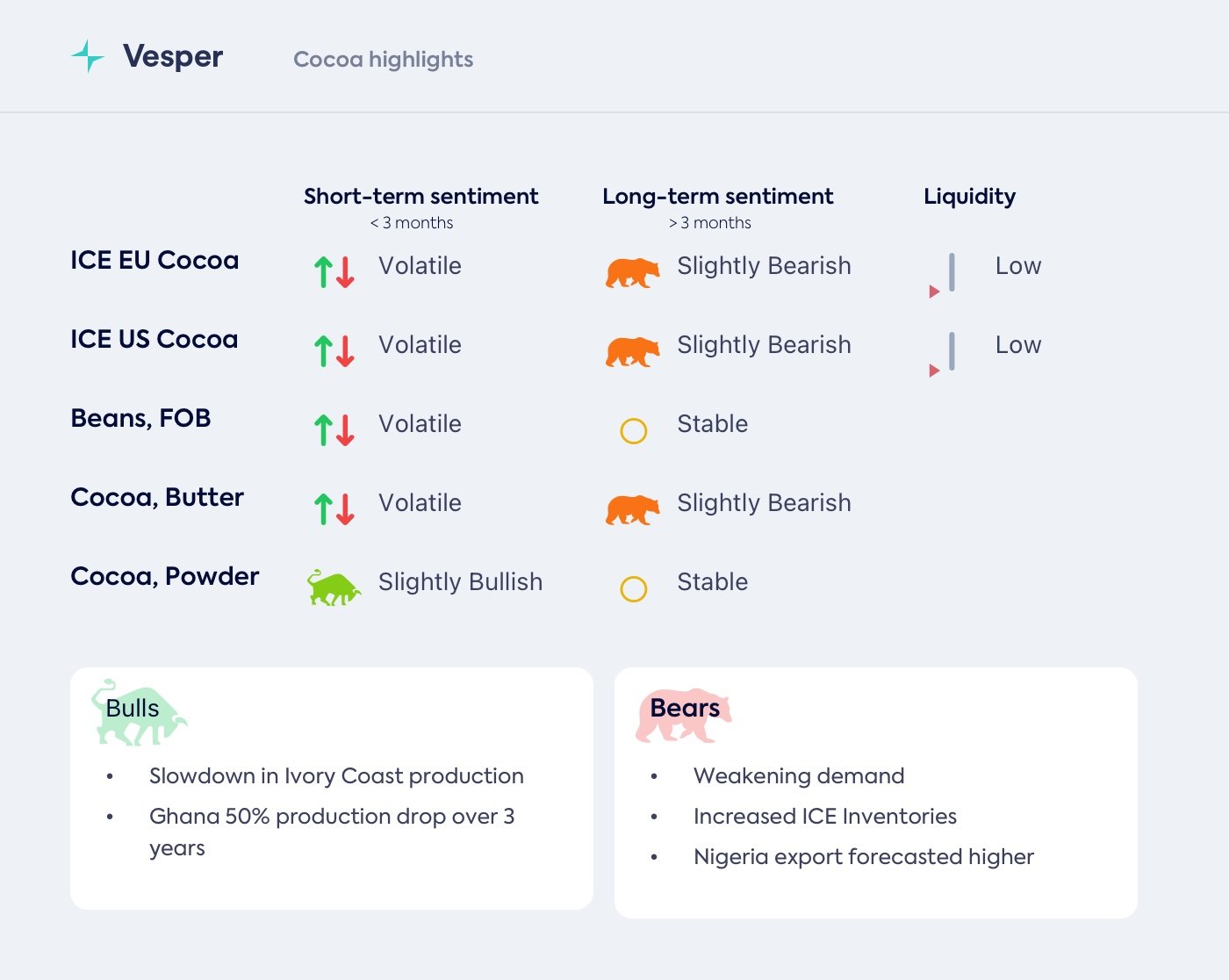 بعد عدة تقلبات حادة في الأسعار على مدار الشهر الماضي، استقرت العقود الآجلة للكاكاو في الأسبوع الماضي، حيث أظهرت تحركات طفيفة فقط على أساس أسبوعي. السوق حاليًا في مرحلة توطيد وجيزة. تعكس الأسعار انتعاشًا في مخزونات الكاكاو إلى أعلى مستوى لها منذ 3 أشهر حيث بلغت 1.53 مليون كيس في الموانئ الأمريكية التي تحتفظ بها ICE. ازدادت الخسائر في سوق لندن بعد أن تعزز الجنيه الإسترليني إلى أعلى مستوى له منذ 4 أشهر. ولكن مع انخفاض السيولة، يظل التقلب مرتفعًا.