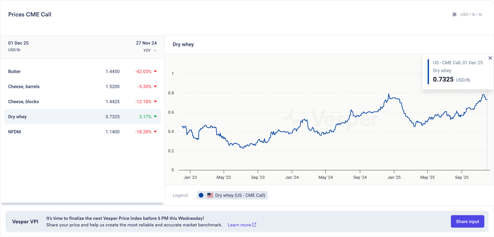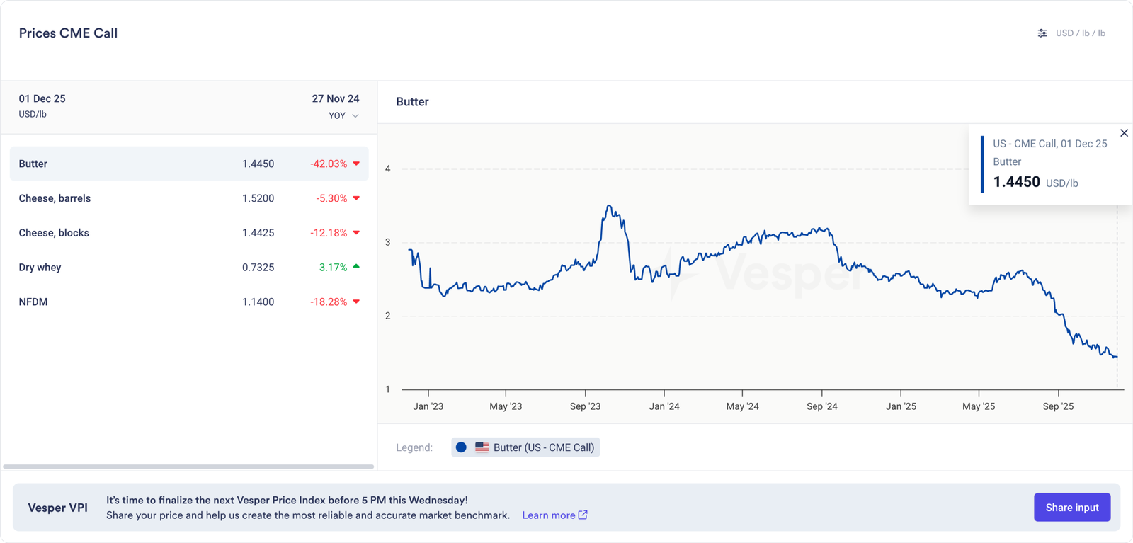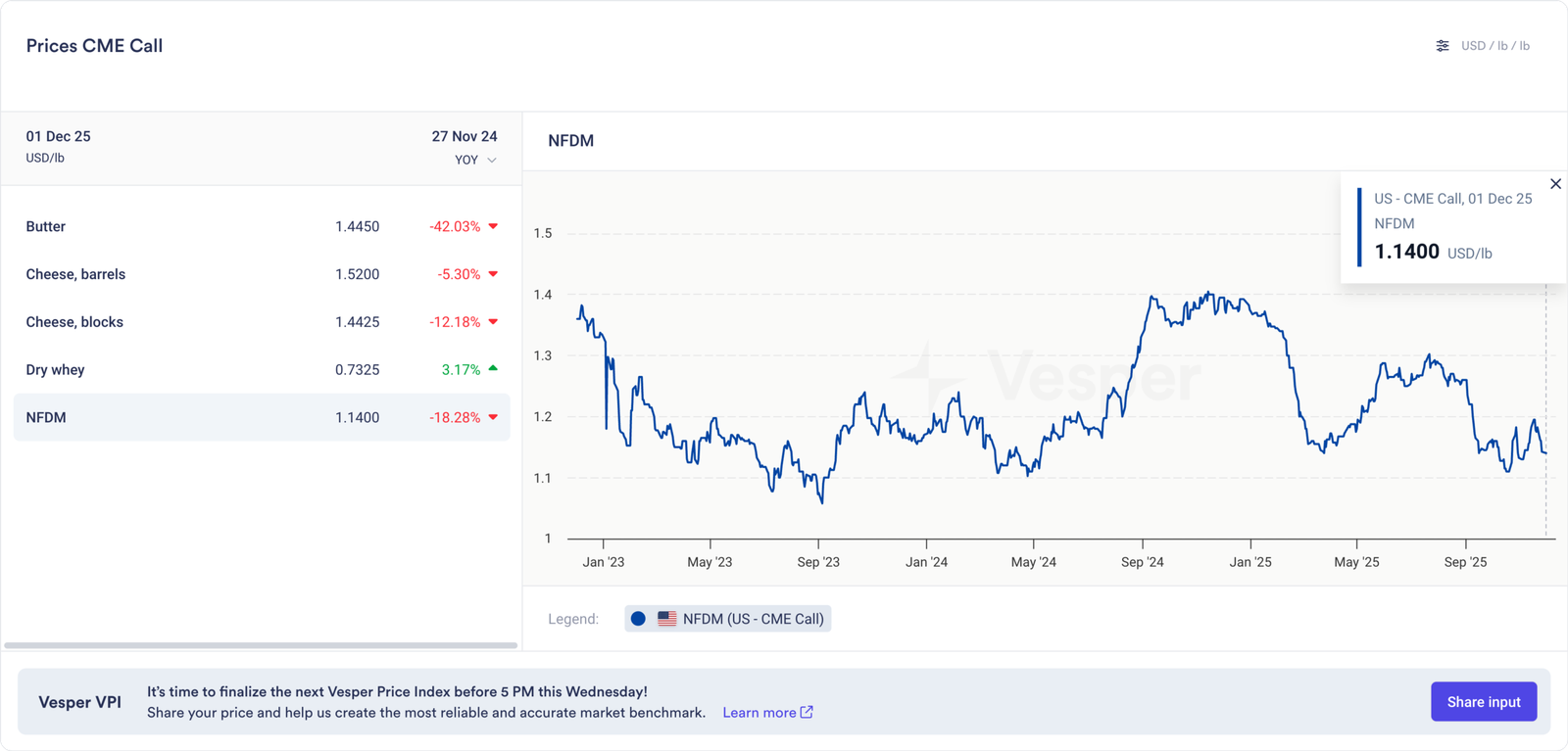 أثر الانخفاض الحاد في أسعار الجبن والزبدة بشدة على قيم الحليب. انخفضت العقود الآجلة من الفئة الثالثة لشهر ديسمبر بمقدار 1.35 دولارًا إلى 15.87 دولارًا لكل قنطار. سجلت عقود الربع الأول خسائر مماثلة وتراجعت إلى منتصف الـ 15 دولارًا. خسرت معظم عقود الفئة الرابعة الآجلة حوالي 60 سنتًا في نوفمبر. أدى ذلك إلى سحب عقود نوفمبر إلى مارس إلى أقل من 14 دولارًا لكل قنطار، وهو المستوى الذي سيؤدي بالتأكيد إلى خسائر مالية لتلك المزارع التي تعتمد على إيرادات الفئة الرابعة.