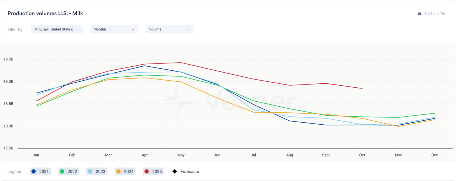 انهارت أسواق الألبان الأمريكية تحت وطأة فيضان الحليب. بعد أطول إغلاق حكومي في تاريخ الولايات المتحدة، نشرت وزارة الزراعة الأمريكية تقارير إنتاج الحليب التي تحدد حجم هذا الفيضان. بلغ إجمالي إنتاج الحليب ما يقرب من 19 مليار رطل في سبتمبر و19.5 مليار رطل في أكتوبر. وكان ذلك أكبر بنسبة 3.8٪ و3.7٪ من العام السابق، على التوالي. على مدى الأشهر القليلة المقبلة، قد يتجاوز إنتاج الحليب في الولايات المتحدة أحجام عام 2024 وأوائل عام 2025 بهوامش أوسع. قد يتجاوز إنتاج الحليب في كاليفورنيا مستويات العام السابق بنسب مئوية مضاعفة عند مقارنته بأعماق دمار إنفلونزا الطيور، وأضاف منتجو الألبان أبقارًا في كاليفورنيا والعديد من الولايات الأخرى.