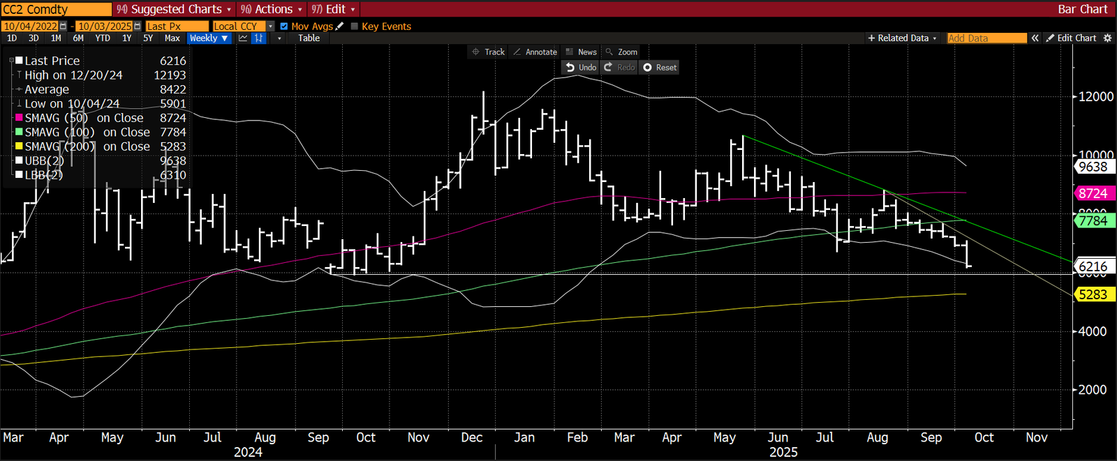 بالمقارنة مع يوم الجمعة 26 سبتمبر، انخفضت العقود الآجلة للكاكاو في لندن، على أساس تاريخ الاستحقاق الثاني في مارس، بمقدار 489 جنيهًا إسترلينيًا أو 10.1٪، وبالمقارنة مع أسبوعين مضت (التقرير الأخير) انخفضت بمقدار 702 جنيهًا إسترلينيًا أو 13.9٪. انخفض الفارق الزمني السنوي Mch 25/Mch 26 بمقدار 130 جنيهًا إسترلينيًا مقارنة بالأسبوع الماضي وانخفض بمقدار 241 جنيهًا إسترلينيًا مقارنة بأسبوعين مضت إلى 10 جنيهات إسترلينية، بالكاد مقلوبًا بعد الآن. بالمقارنة مع يوم الجمعة 26 سبتمبر، انخفضت العقود الآجلة للكاكاو في نيويورك لشهر مارس بمقدار 718 دولارًا أمريكيًا أو 10.4٪، وبالمقارنة مع أسبوعين مضت انخفضت بمقدار 1013 دولارًا أمريكيًا أو 14٪. انخفض الفارق الزمني السنوي Mch 25/Mch 26 بمقدار 294 دولارًا أمريكيًا مقارنة بالأسبوع الماضي وانخفض بمقدار 335 دولارًا أمريكيًا مقارنة بأسبوعين مضت إلى 123 دولارًا أمريكيًا.