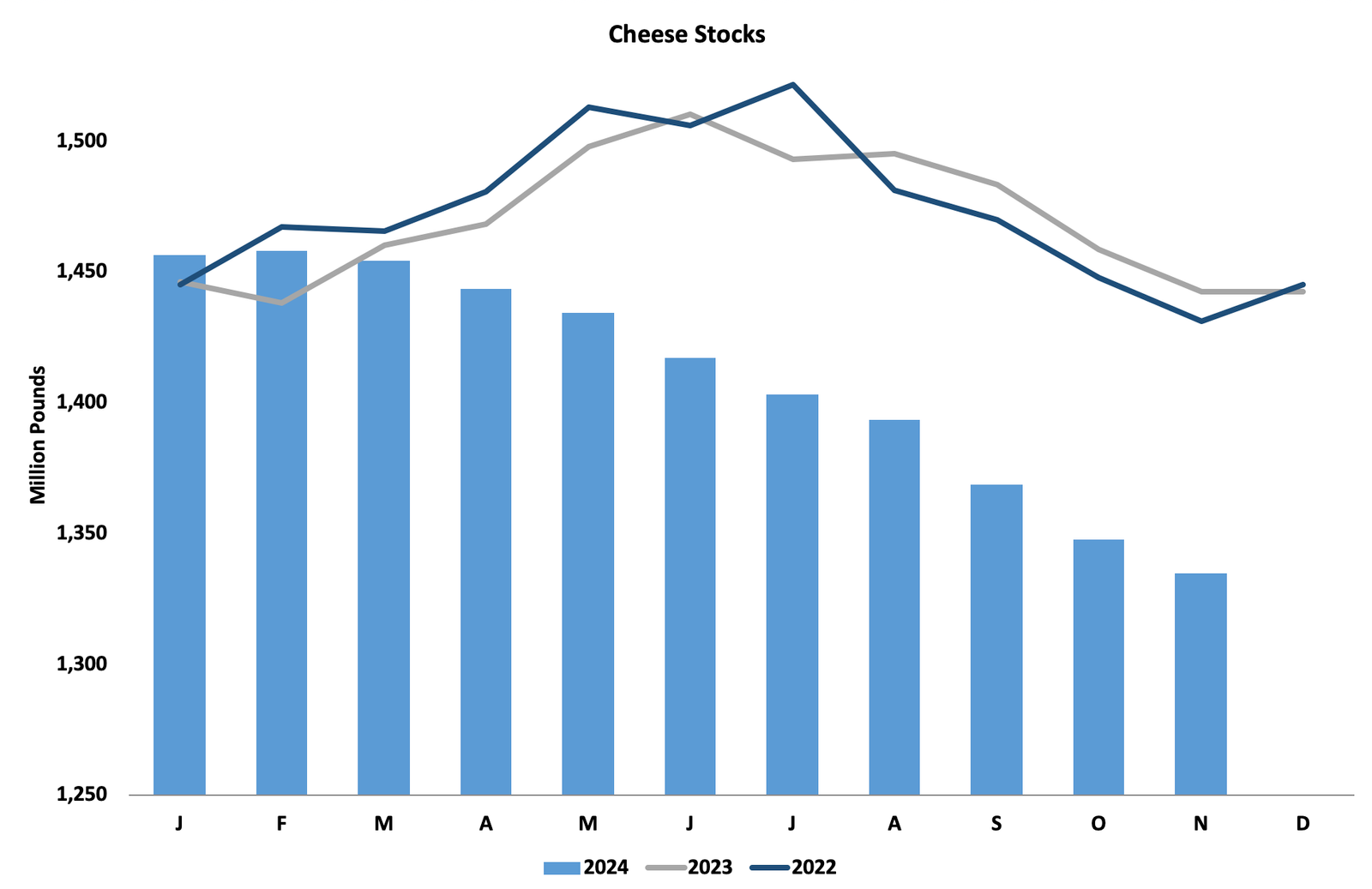 ارتفعت أسعار الجبن بشكل كبير في ديسمبر. أنفق بائعو الجبن شهري أكتوبر ونوفمبر في الاستعداد لزيادة كبيرة في الإنتاج مع بدء المصانع الجديدة في صنع الجبن. لكن المصنع الأحدث كافح مع مشكلات البدء النموذجية، ولم يصل بعد سيل جبنة الشيدر الطازجة. تعلم السوق أنه يجب عليه التعامل مع كمية أكبر بكثير من الجبن في النهاية. ولكن في الوقت الحالي، تعتبر إمدادات الجبن ضيقة بعض الشيء. بفضل الصادرات القوية، انخفضت المخزونات لمدة تسعة أشهر متتالية. في نوفمبر، تقلصت بمقدار 13 مليون رطل أخرى. عند 1.33 مليار رطل، كانت مخزونات الجبن في 30 نوفمبر أصغر بنسبة 7.5٪ مما كانت عليه قبل عام وكانت أصغر حجم في نوفمبر منذ عام 2019. أدت المخزونات الأكثر إحكامًا إلى ارتفاع أسعار الجبن وأسواق الفئة الثالثة بشكل حاد في ديسمبر. قفزت كتل جبنة الشيدر بمقدار 26.75 سنتًا أمريكيًا لتصل إلى 1.91 دولارًا أمريكيًا للرطل، بزيادة قدرها 16٪. ارتفعت البراميل بمقدار 22 سنتًا أمريكيًا لتصل إلى 1.825 دولارًا أمريكيًا.