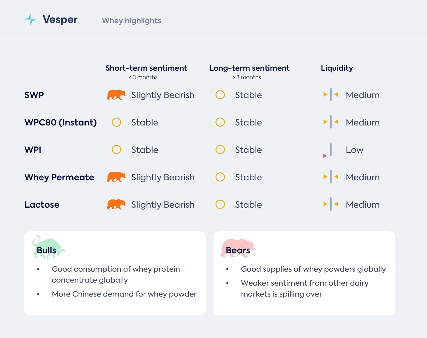 من الناحية الأساسية، لا نرى الكثير من التغيير في سوق مسحوق مصل اللبن. لا يزال WPC80 و WPI باهظي الثمن بسبب ارتفاع الطلب وانخفاض المعروض نسبيًا، وهو ما لا يُتوقع تغييره قريبًا. نعم، لقد حدثت توسعات في القدرة الإنتاجية، لكن هذه العملية لم تتمكن بعد من تغيير توازن العرض والطلب. في النهاية، لسنا متأكدين أيضًا مما إذا كان هذا سيحدث في أي وقت قريب.