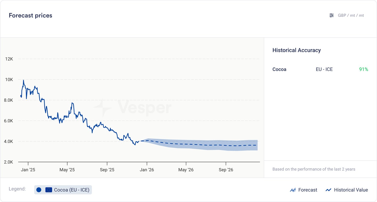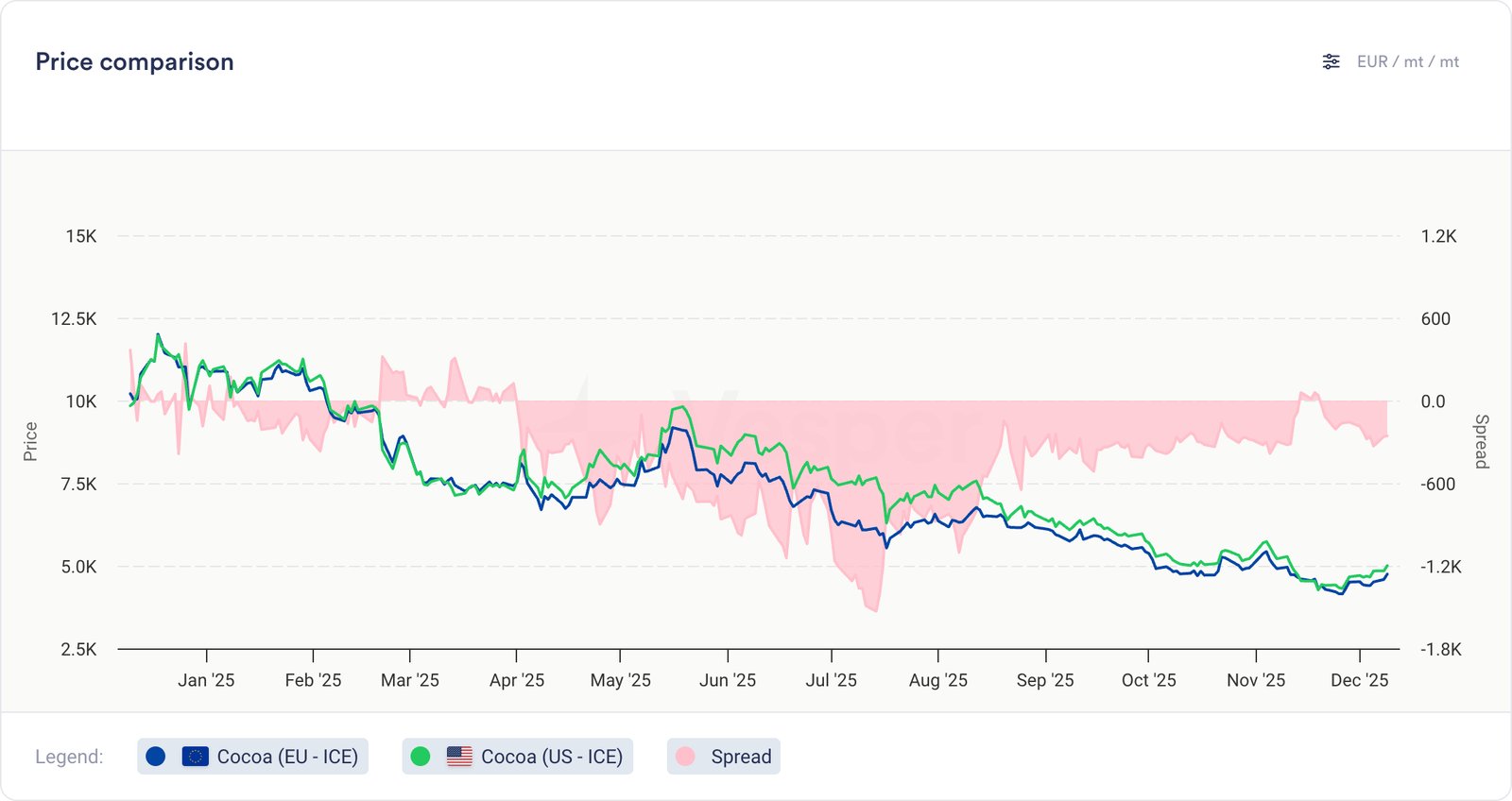 الرسم البياني 1: ICE US مقابل ICE EU Cocoa Futures – اتجاه الأسعار لمدة 12 شهرًا مع الفارق (جنيه إسترليني/طن متري)