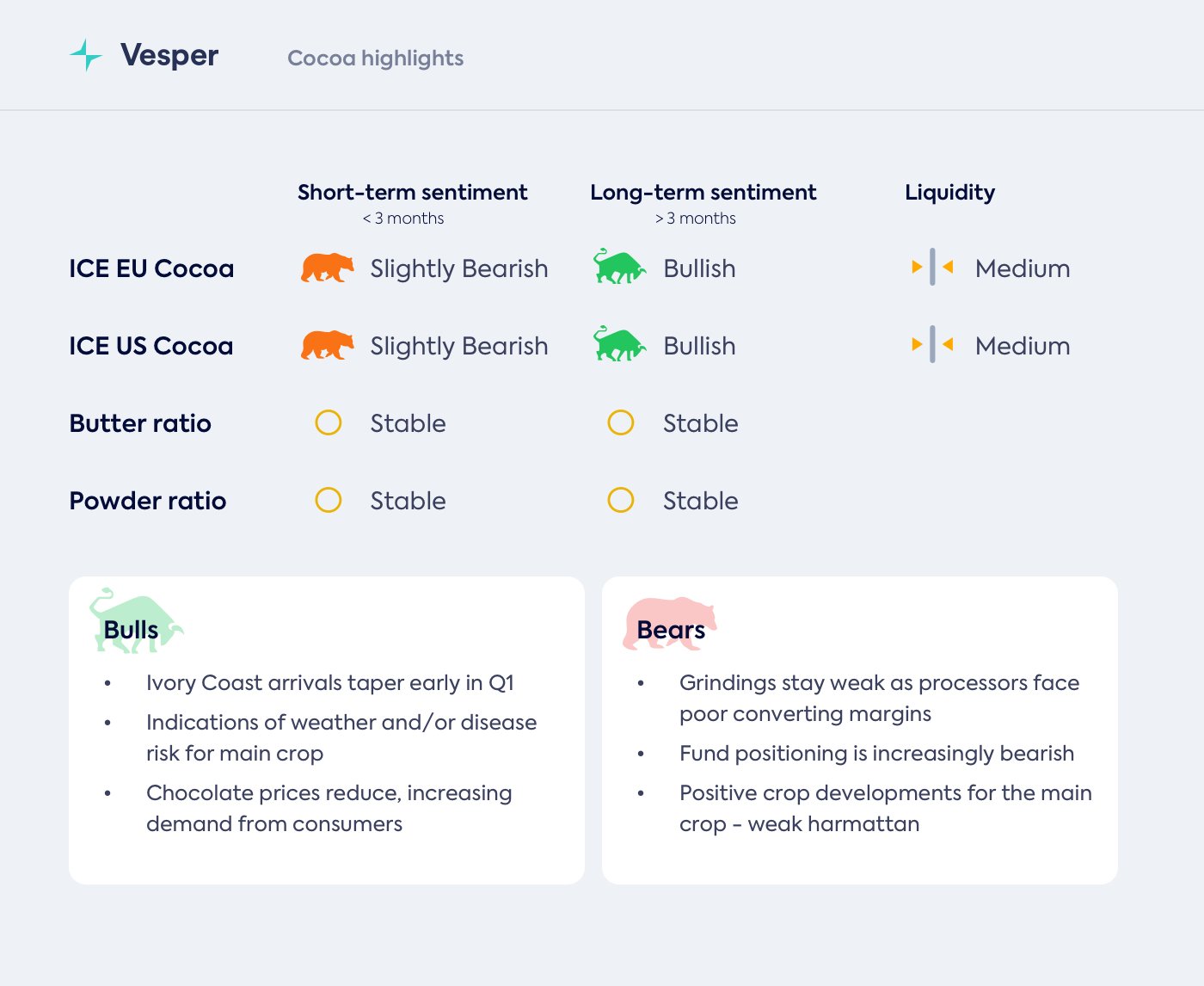 أدى انخفاض وصول حبوب الكاكاو إلى موانئ ساحل العاج من المستويات المرتفعة موسمياً إلى إحداث تحول طفيف في المعنويات، فقد أصبح الإجماع متفائلاً بعض الشيء بشأن العرض. من أجل الارتفاع أكثر، نحتاج إلى رؤية انتعاش في الطلب، وهو أمر غير مسعر حاليًا في توقعات طحن الربع الرابع. إذا استمرت ظروف رياح موسمية خفيفة وظل الطلب ضعيفًا، فمن المرجح أن تظل الأسعار حول المستويات الحالية حتى العام الجديد. بالأسعار الحالية، شهدنا زيادة في تغطية الصناعة، بعد انخفاضها بأكثر من 50٪ في عام 2025، وصلت الأسعار إلى مستوى أكثر منطقية، ولكن المشاكل الهيكلية طويلة الأجل تعني أنها يجب أن تظل أعلى من المعدلات التاريخية.
