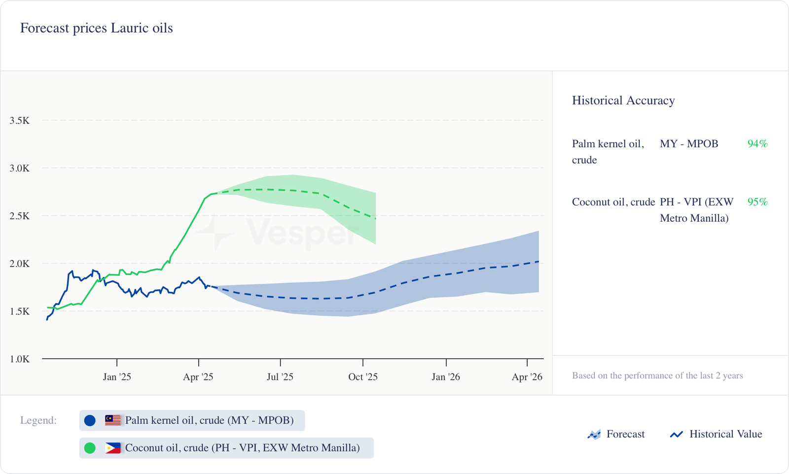 - وصل زيت جوز الهند لشحنات مايو/يونيو إلى 2525 دولارًا أمريكيًا/طن متري في 10 أبريل – بزيادة 27٪ عن متوسط يناير – ويحمل الآن علاوة كبيرة تبلغ 500 دولار أمريكي/طن متري على زيت نواة النخيل.