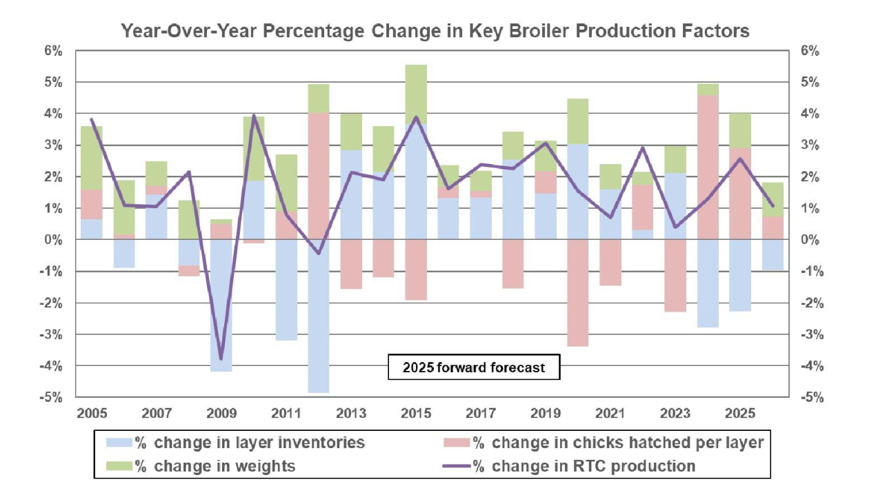أكد الحصول على أول تقرير عن ذبح الدواجن منذ انتهاء إغلاق الحكومة أن معدل بقاء الدواجن على قيد الحياة في صناعة الدجاج اللاحم في الولايات المتحدة في حالة انتعاش، وبلغ أعلى مستوى له في ثلاث سنوات خلال الربع الثالث (يوليو-سبتمبر). وقد ساعد هذا الانتعاش في ترسيخ النمو في حجم الدجاج الجاهز للطهي بما يزيد عن 3.5٪ خلال النصف الثاني من عام 2025، ومن المتوقع أن يحقق زيادة إجمالية تزيد عن 2.5٪ هذا العام مقارنة بعام 2024. ومع ذلك، تشير المؤشرات الرائدة إلى تباطؤ مع اقتراب عام 2026. بلغ إجمالي عمليات وضع كتاكيت الدجاج اللاحم في جميع أنحاء الولايات المتحدة الأسبوع الماضي 195.4 مليون، وهو ما يمثل زيادة طفيفة بنسبة 0.4٪ عن الأسبوع نفسه من العام الماضي. ارتفع إجمالي عمليات الوضع لمدة ستة أسابيع (1.14 مليار) بنسبة 0.8٪ عن الفترة نفسها من العام الماضي، ولكن بناءً على المسار الأخير لمجموعات البيض، حتى هذه الوتيرة المتواضعة نسبيًا للنمو يجب أن تستمر في الاعتدال في الأسابيع المقبلة. تتوقع LEAP Market Analytics (LMA) أن يزداد إنتاج الدجاج اللاحم الجاهز للطهي في الولايات المتحدة بنسبة 1.1٪ فقط بشكل عام في العام المقبل، وهذا يفترض أن معظم الانتعاش الأخير في معدل البقاء على قيد الحياة “ثابت”. كان هناك الكثير من التقلبات في هذا المقياس في السنوات الأخيرة لدرجة أنه يبدو من الصعب التنبؤ به، لكن التوقعات تتماشى بشكل معقول مع خط الاتجاه طويل الأجل كما لوحظ قبل منتصف عام 2022 تقريبًا.