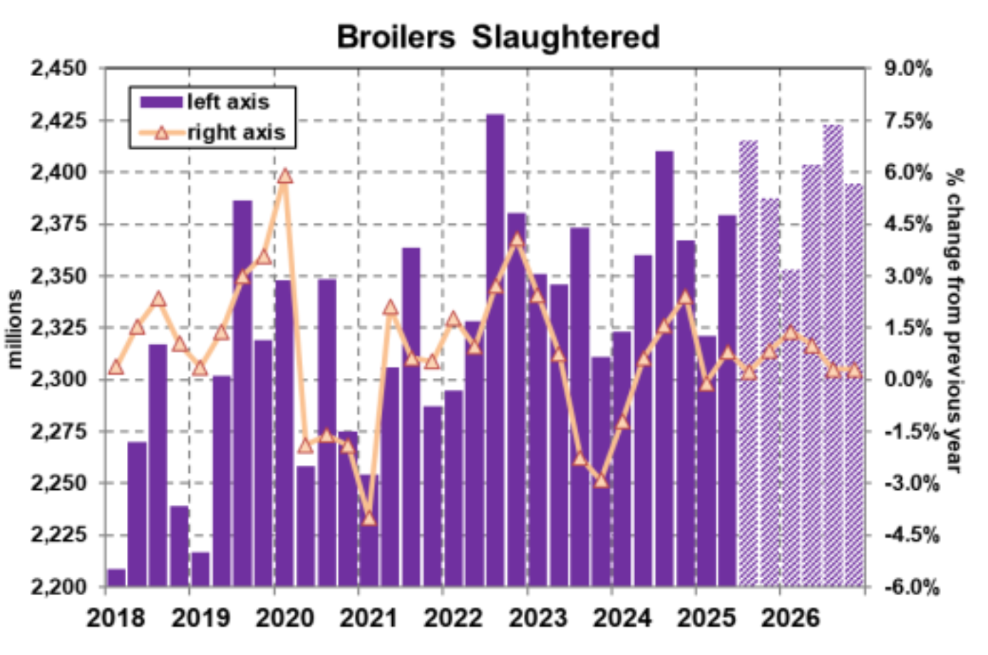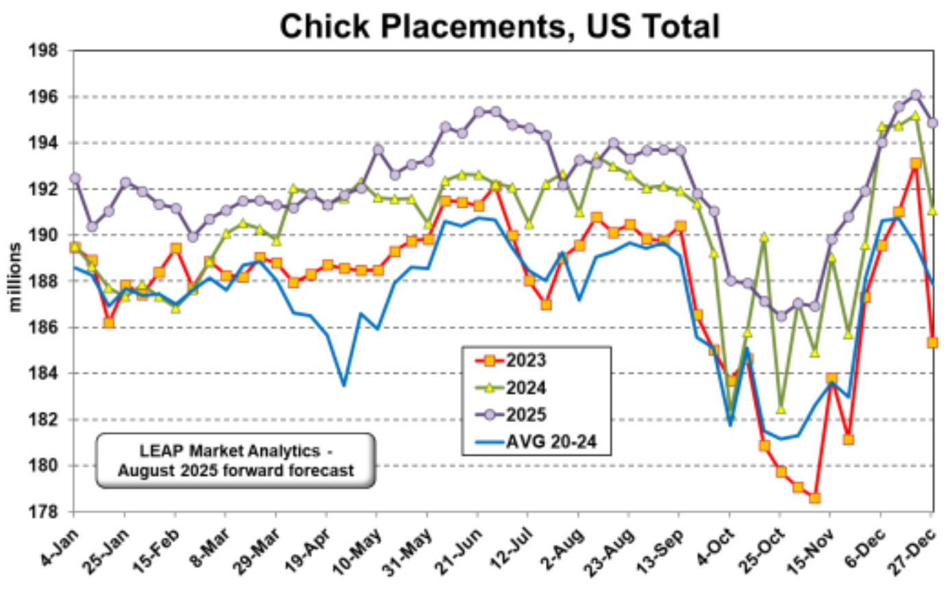 لا تزال الزيادات السنوية في إنتاج المفرخات الأسبوعية مستقرة ومتواضعة نسبيًا، ومع اقتراب الخريف، يجب أن تبدأ أعداد الرؤوس في الانخفاض بعد عيد العمال مباشرة وأن تظل في حالة انخفاض حتى قرب عيد الشكر. تم وضع ما يقرب من 194.0 مليون كتكوت دجاج لاحم في المزارع الأسبوع الماضي، وهو ما يمثل زيادة طفيفة بنسبة 0.5٪ عن الأسبوع نفسه في عام 2024. وعلى مدار الأسابيع الستة الماضية، ارتفعت عمليات التنسيب بنسبة 0.8٪ فقط فوق مستويات العام السابق (عند 1.16 مليار). مع الأخذ في الاعتبار مسار عمليات وضع الكتاكيت على هذا النحو، يجب أن يتبع الذبح هذا المسار بوتيرة نمو مقاسة على الأقل على المدى القريب/المتوسط، ولن تتفاجأ شركة LEAP Market Analytics (LMA) إذا ظل الدفع التوسعي خافتًا بعض الشيء بعد ذلك. يمكن أن تظهر إشارة إلى “التسارع” في أوائل العام المقبل، مع زيادات سنوية في حدود 1.5٪ في المتناول، ولكن هذا سيكون في المقام الأول دالة على المقارنة مع خط أساس منخفض – انخفض الذبح خلال الربع الأول (يناير-مارس) من هذا العام بنسبة 0.1٪ عن العام الماضي – بدلاً من التحول الهادف في القدرة (الاستخدام) أو البنية التحتية. من المتوقع أن يستمر توافر لحوم الدجاج اللاحم للفرد على المستوى المحلي في الارتفاع بوتيرة مماثلة لما اعتاد عليه المشاركون في السوق على مدار العقد الماضي وحتى عام 2026.