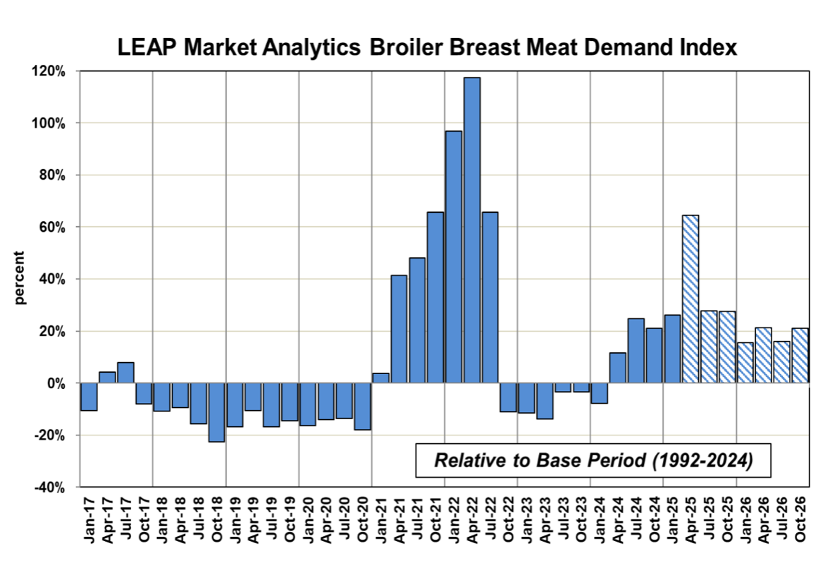 بإلقاء نظرة سريعة، يعطي هذا انطباعًا هبوطيًا، ولكن مع الأخذ في الاعتبار توسع قاعدة العرض بمرور الوقت والحالة القوية للطلب في هذه الفئة، يبدو أنه ليس مرهقًا بشكل خاص من حيث تأثير السوق وربما يوصف بأنه “محايد”، إن لم يكن داعمًا اسميًا. أسعار البيع الفوري للحوم الثدي الخالية من العظم والجلد آخذة في الارتفاع مرة أخرى، حيث بلغ متوسطها 1.95 دولارًا أمريكيًا للرطل (USDA) الأسبوع الماضي. يتوافق سلوك الأسعار الأخير في هذه الفئة بشكل كبير مع الاتجاهات الموسمية السائدة على مدار السنوات القليلة الماضية، على الرغم من أنه يبدو أن الطلب قد انخفض على أساس معدل موسمياً من مستويات “مثيرة” بشكل لا يصدق خلال الربع الثاني (أبريل-يونيو). ومع ذلك، ليس الأمر كما لو أن الطلب على لحوم الثدي الخالية من العظم والجلد قد انهار. بدلاً من ذلك، يبدو أن قراءات المؤشر تستقر في نطاق يتوافق مع الملاحظات من منتصف عام 2024 حتى أوائل عام 2025، والتي تعتقد LEAP Market Analytics (LMA) أنها مستدامة على المدى القريب / المتوسط.
