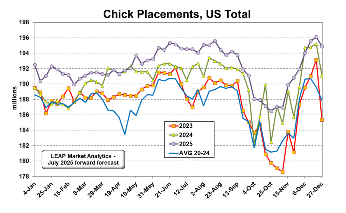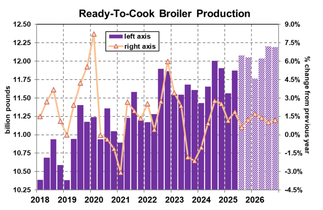 لا تشير بيانات المفرخات الأخيرة الصادرة عن USDA-NASS إلى أن توسع صناعة دجاج التسمين يكتسب زخمًا، بل يستقر أو ربما يتباطأ قليلاً، إذا جاز التعبير. يمثل 194.1 مليون كتكوت التي تم وضعها في المزارع الأسبوع الماضي زيادة بنسبة 0.7٪ عن العام السابق. ويمثل ذلك أضعف معدل نمو منذ ما يقرب من ثلاثة أشهر، على الرغم من أن بعض ذلك يمكن أن يعزى إلى التباين في تقديرات العام السابق. على مدى الأسابيع الستة الماضية، لا تزال الكميات الموضوعة (1.17 مليار) متقدمة على وتيرة العام السابق بنسبة 1.4٪. يجب أن تحافظ الكميات الموضوعة على وضع مماثل حتى أغسطس ولكنها تبدأ في الانخفاض بحلول سبتمبر، ويجب أن يبشر وصول الخريف بانخفاض أكثر وضوحًا، وإن كان مؤقتًا. من المتوقع أن تصل الكميات الموضوعة أسبوعيًا إلى القاع عند حوالي 186-188 مليون في أكتوبر قبل أن ترتفع مرة أخرى بما يتماشى مع الوتيرة الأخيرة، إن لم يكن متقدمًا عليها قليلاً، بحلول نهاية العام. انخفض إنتاج الدجاج الجاهز للطهي (RTC) قليلاً عن توقعات LEAP Market Analytics (LMA) في يونيو عند 3.93 مليار رطل. ويمثل ذلك زيادة بنسبة 5.4٪ عن نفس الشهر من العام الماضي، وهو ما يبدو مثيرًا للإعجاب في البداية، ولكن مع تعديل حقيقة أن يونيو 2025 احتوى على يوم عمل إضافي واحد لعمليات المصنع العادية مقارنة بيونيو 2024، فإن الزيادة تتقلص إلى 0.4٪ فقط.