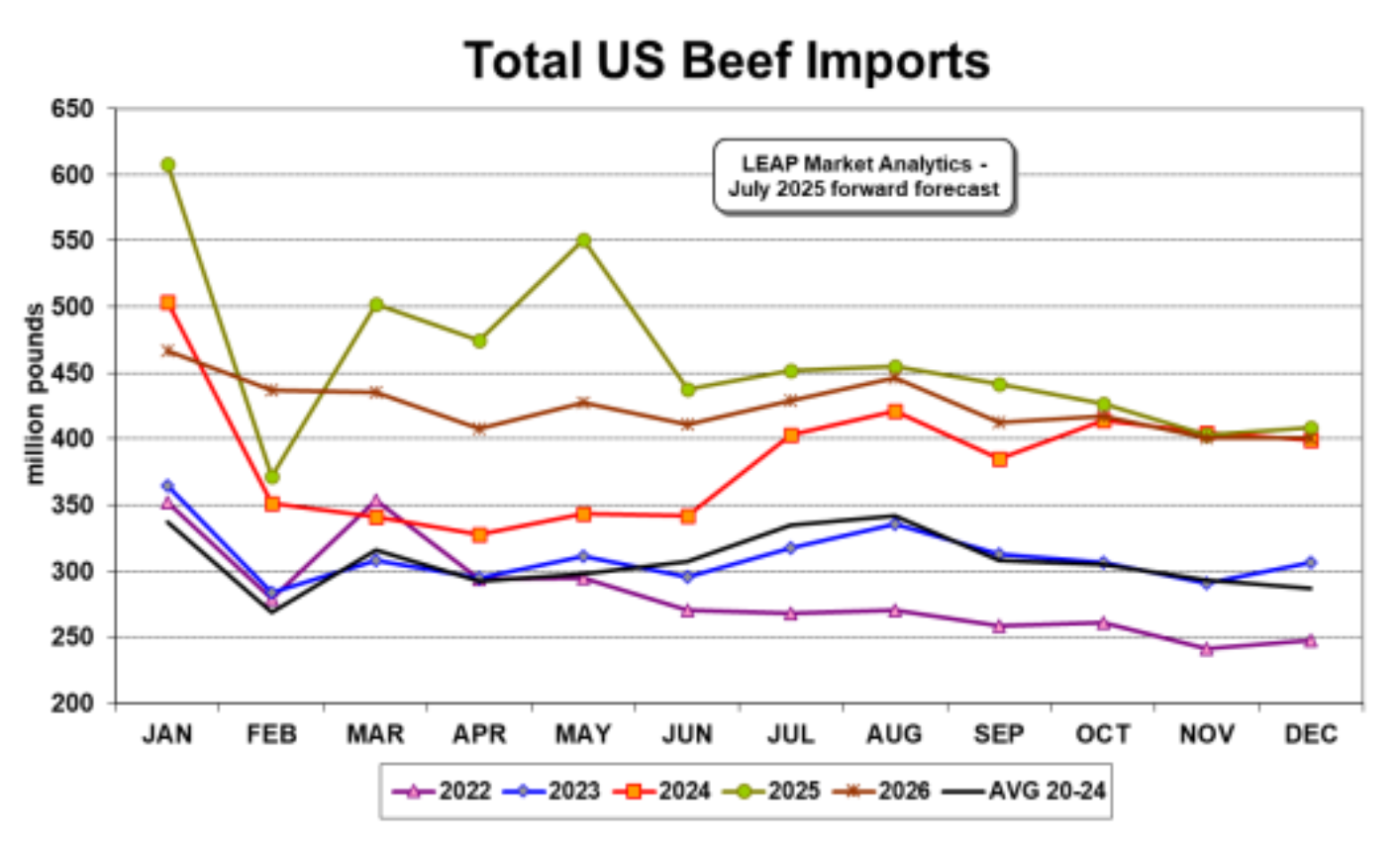 ساهمت التدفقات التجارية الصافية خلال النصف الأول من هذا العام، والتي كانت كثيفة الاستيراد، في زيادة بنسبة 2.9٪ في توافر لحوم البقر للفرد في الداخل. يثبت أن الوتيرة الباهتة للغاية للتسويق المحلي وإنتاج لحوم البقر خلال النصف الثاني من العام تمثل تحديًا أكبر بكثير للتغلب عليه. تتوقع LEAP Market Analytics (LMA) انخفاضًا بنسبة 0.7٪ في توافر لحوم البقر للفرد في الداخل عن العام الماضي خلال النصف الثاني من عام 2025. ومع ذلك، فإن ذلك سيؤدي إلى رقم سنوي قدره 56.9 رطلاً (على أساس الوزن الخالي من العظم)، وهو ما سيزيد بنسبة 1.1٪ عن العام السابق ويمثل أعلى إجمالي سنوي منذ عام 2009. من المقرر أن يصل إجمالي توافر لحوم البقر والدجاج والديك الرومي للفرد إلى مستوى قياسي جديد على الإطلاق هذا العام، وإن كان بزيادة متواضعة نسبيًا (أقل من نصف بالمائة) عن عام 2024. بالعودة إلى مناقشة التجارة، بالنسبة للماشية ولحوم البقر، لا تزال الحالة “صعبة” بسبب الوجود (المتزايد) لـ New World Screwworm (NWS) في المكسيك. لا تزال الحدود مع المكسيك مغلقة أمام شحنات الماشية الحية، وتعتقد LMA أنه من الآمن تمامًا، في هذه المرحلة، افتراض أن بروتوكولات الاحتواء الصارمة ستحافظ على واردات الماشية الحية من المكسيك عند أو بالقرب من الصفر في المستقبل المنظور.