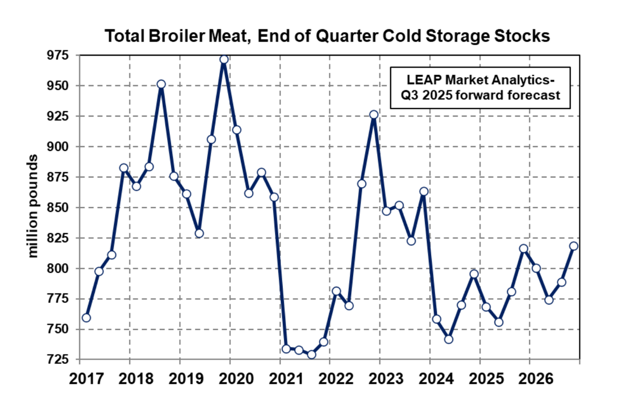 بعد مراجعة آخر تحديثات العرض من وزارة الزراعة الأمريكية-NASS، تعتقد شركة LEAP Market Analytics (LMA) أنه من الحكمة أن نهدف إلى توقعات وزن أعلى قليلاً لبقية عام 2025 والعام المقبل أيضًا. تظل النظرة المتوقعة على عدد الرؤوس دون تغيير إلى حد كبير، لكن النظرة المعدلة على أوزان الطيور تشير إلى نمو سنوي في إنتاج الدجاج اللاحم الجاهز للأكل (RTC) بأكثر من 1.5٪ بقليل هذا العام والعام المقبل، مع اندفاعات عرضية تزيد عن 2.0٪. لا يزال هذا مقيدًا نسبيًا مقارنة بالمسار الطويل للتاريخ، ولكنه يمثل اسميًا دفعة في اتجاه أكثر انخفاضًا لسوق يتعامل بالفعل مع قوى جانب الطلب المتذبذبة. ومع ذلك، لا تشير جميع مؤشرات جانب العرض إلى إشارات انخفاضية، حيث كشف أحدث تقرير التخزين البارد عن انخفاض حاد إلى حد ما في إجمالي مخزون اللحوم المجمدة من الدجاج اللاحم خلال شهر أغسطس، حيث انخفضت المخزونات إلى 784 مليون رطل في نهاية الشهر من 800 مليون رطل في نهاية يوليو. هذا تجاوز بسهولة متوسط تعديل المخزون خلال شهر أغسطس على مدار السنوات الخمس الماضية (2020-24)، والذي كان انخفاضًا قدره 940 ألف رطل. كان إجمالي نهاية أغسطس أكبر بنسبة 4.0٪ من العام الماضي في نفس التاريخ (754 مليون رطل) ولكنه لا يزال أقل بنسبة 1.6٪ من متوسط الخمس سنوات لنفس التاريخ (797 مليون رطل).