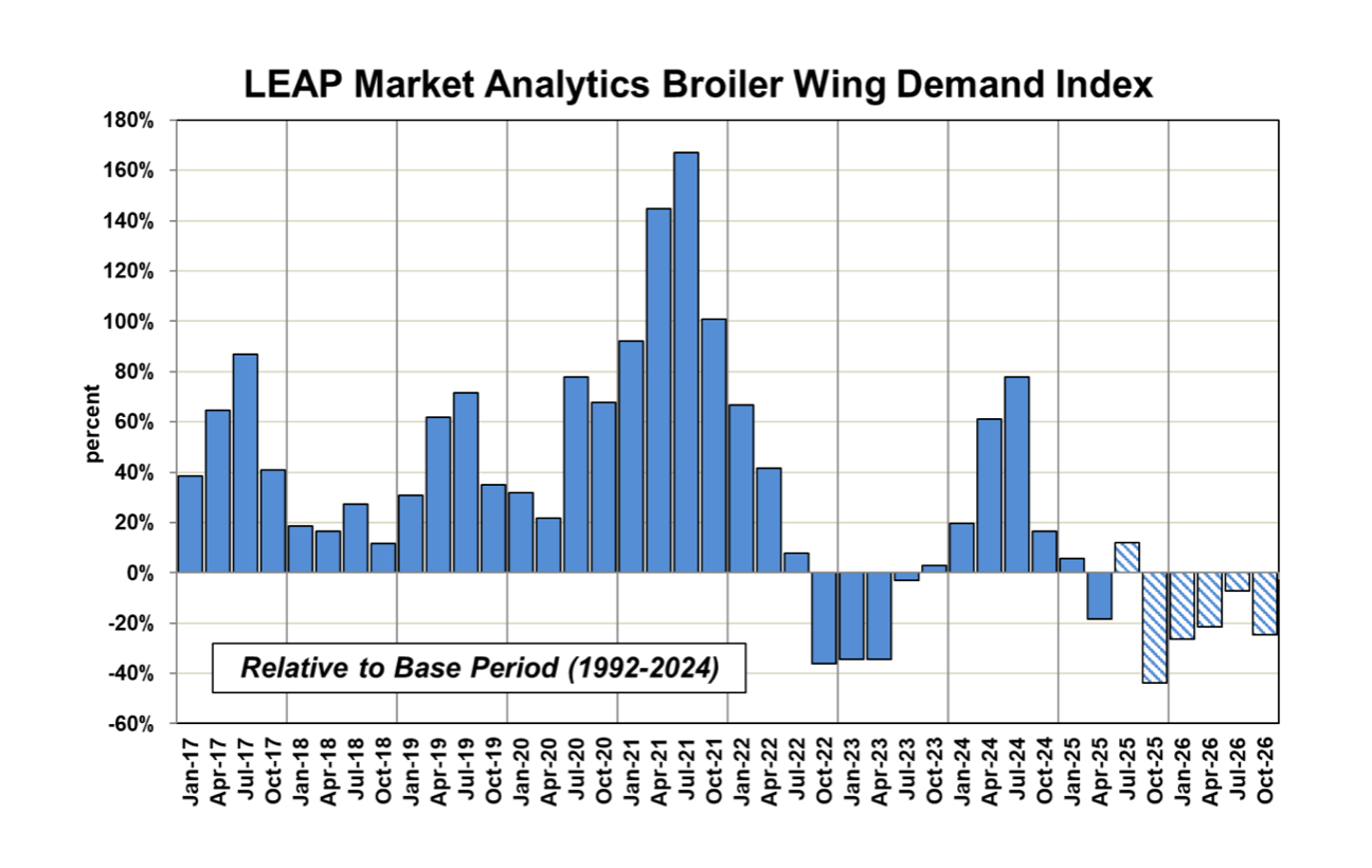 تتتبع قراءات الطلب الحالية في مساحة الأجنحة عن كثب “الآثار” التي أعقبت الوباء. كان هذا الركود قائمًا بحلول أواخر عام 2022 وامتد حتى منتصف عام 2023. تتدهور الأجنحة التقليدية بالعظام الآن على جبهتين، إحداهما تحول عام في التفضيل بين الأجيال الشابة التي تفضل المنتجات الخالية من العظام على تلك التي تحتوي على عظام (أكثر من الأجيال الأكبر سنًا على أي حال) والأخرى تباطؤ ملحوظ في أعمال المطاعم، وخاصة قطاعات الوجبات السريعة والعادية حيث تهيمن الأجنحة والمناقصات. دخل الطلب على مناقصات الدجاج أيضًا في دورة هبوطية بعد التكيف مع التأثيرات الموسمية، ولكن بالنظر إلى التحول في التفضيل المذكور أعلاه، فإن التراجع في هذه الفئة ليس حادًا مثل ما يحدث في مساحة الأجنحة. بمجرد أن تهدأ الأمور من تعديلات الأسعار هذه ويرى المشترون نوع القيمة التي تقدمها هذه العناصر مقارنة بفئات البروتين المنافسة، يجب أن يبدأ الطلب في “التحسن” مرة أخرى، ولكن قد يستغرق ذلك ربعًا أو ربعين حتى يكتمل. حتى مع وجود لمحة عن الانتعاش، تحتفظ LMA برؤية محافظة للغاية للاقتصاد الأمريكي الأوسع وظروف خدمات الطعام حتى عام 2026، والطلب على الأجنحة والمناقصات، بالتالي. لن يكون من المستغرب على الإطلاق أن نرى الأجنحة الكاملة التقليدية بالعظام تبقى أقل من علامة 1.50 دولارًا أمريكيًا والمناقصات أقل من علامة 2 دولارًا أمريكيًا خلال بقية العام المقبل.
